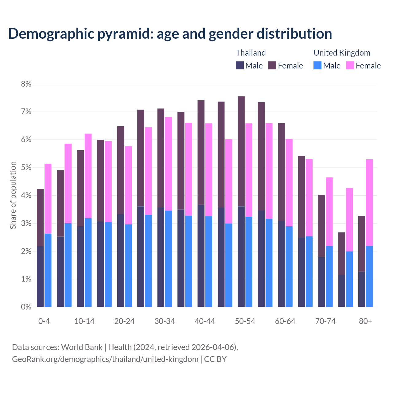 The share of older people aged 65 and over is 15.4% in Thailand and 19.5% in the United Kingdom. Life expectancy in Thailand compared to the United Kingdom .