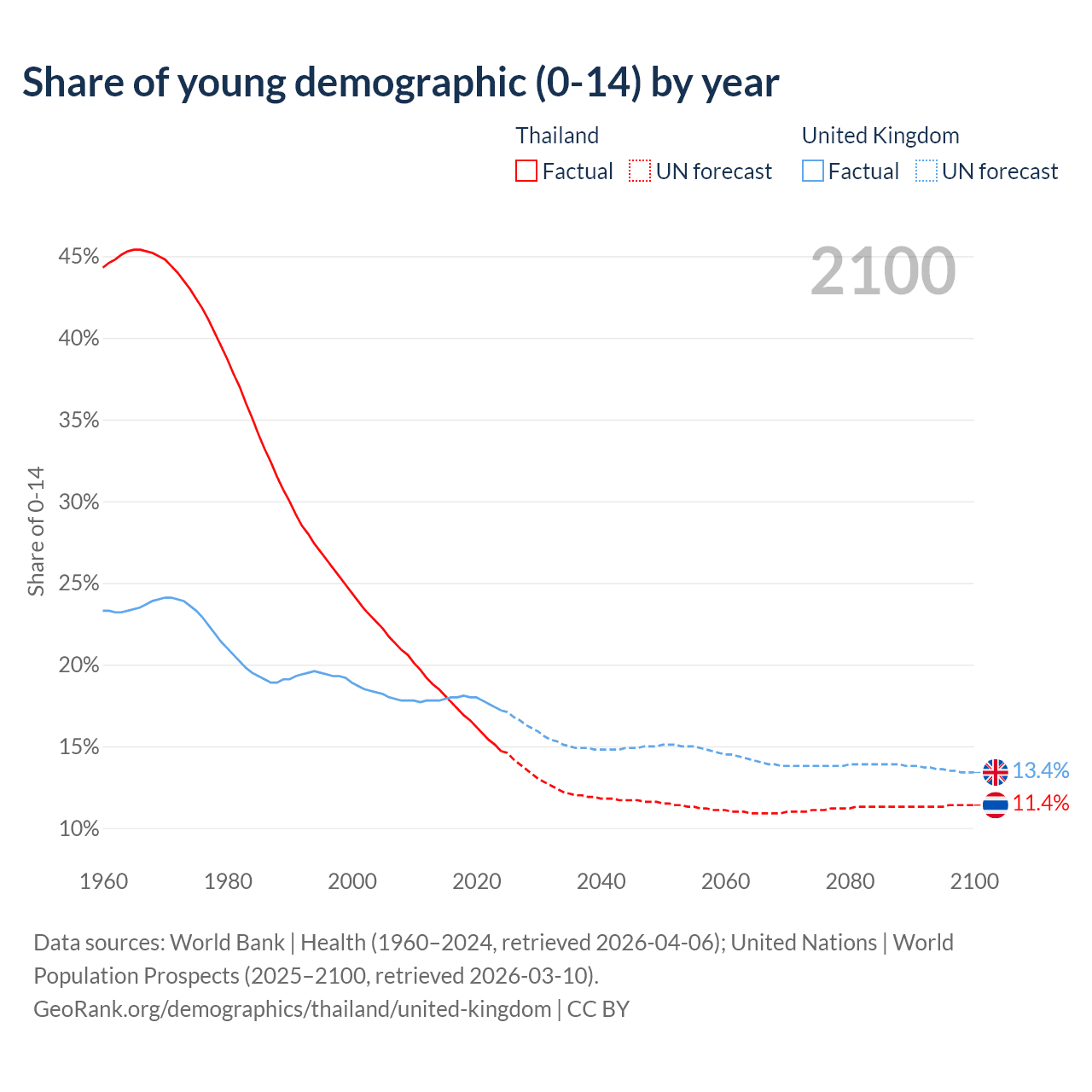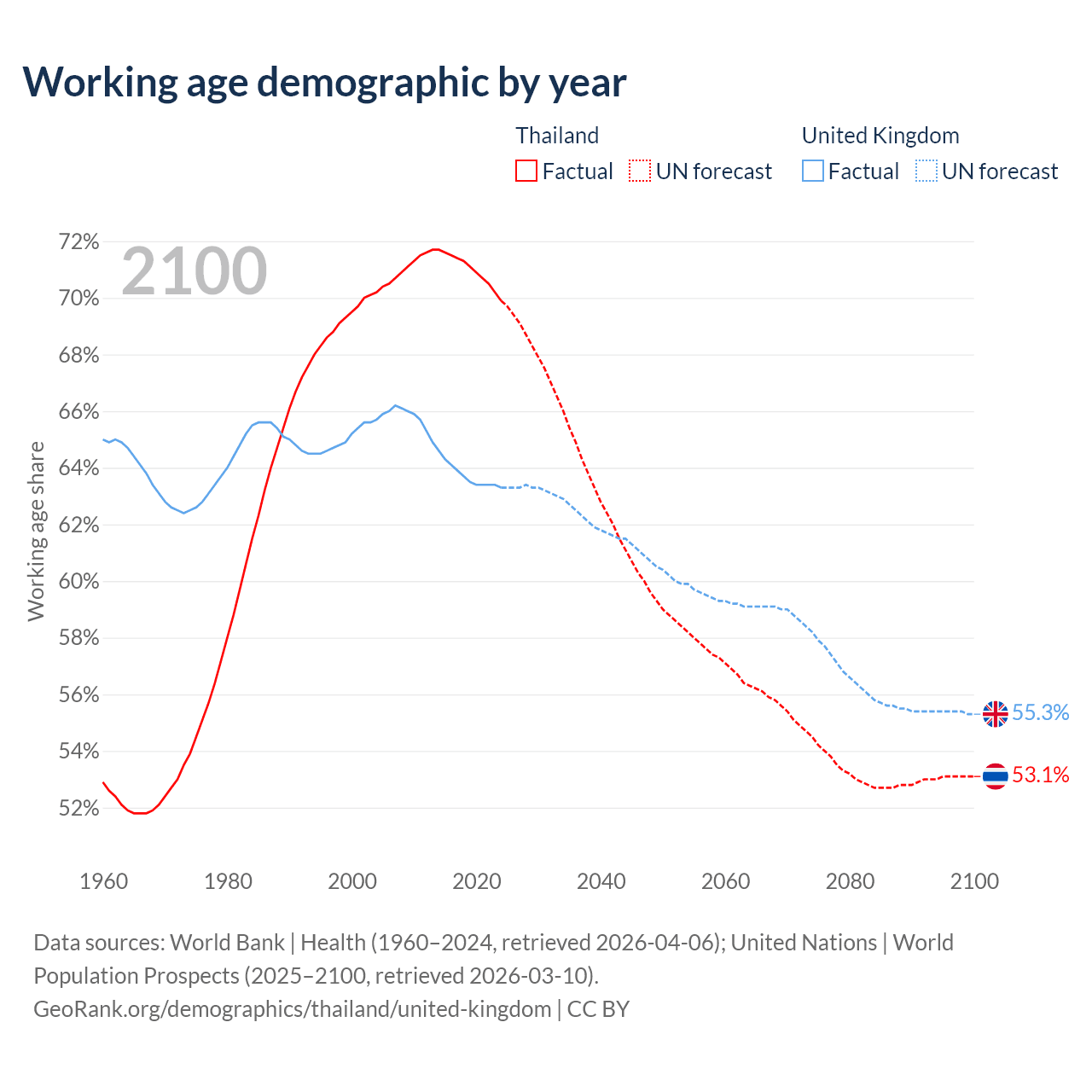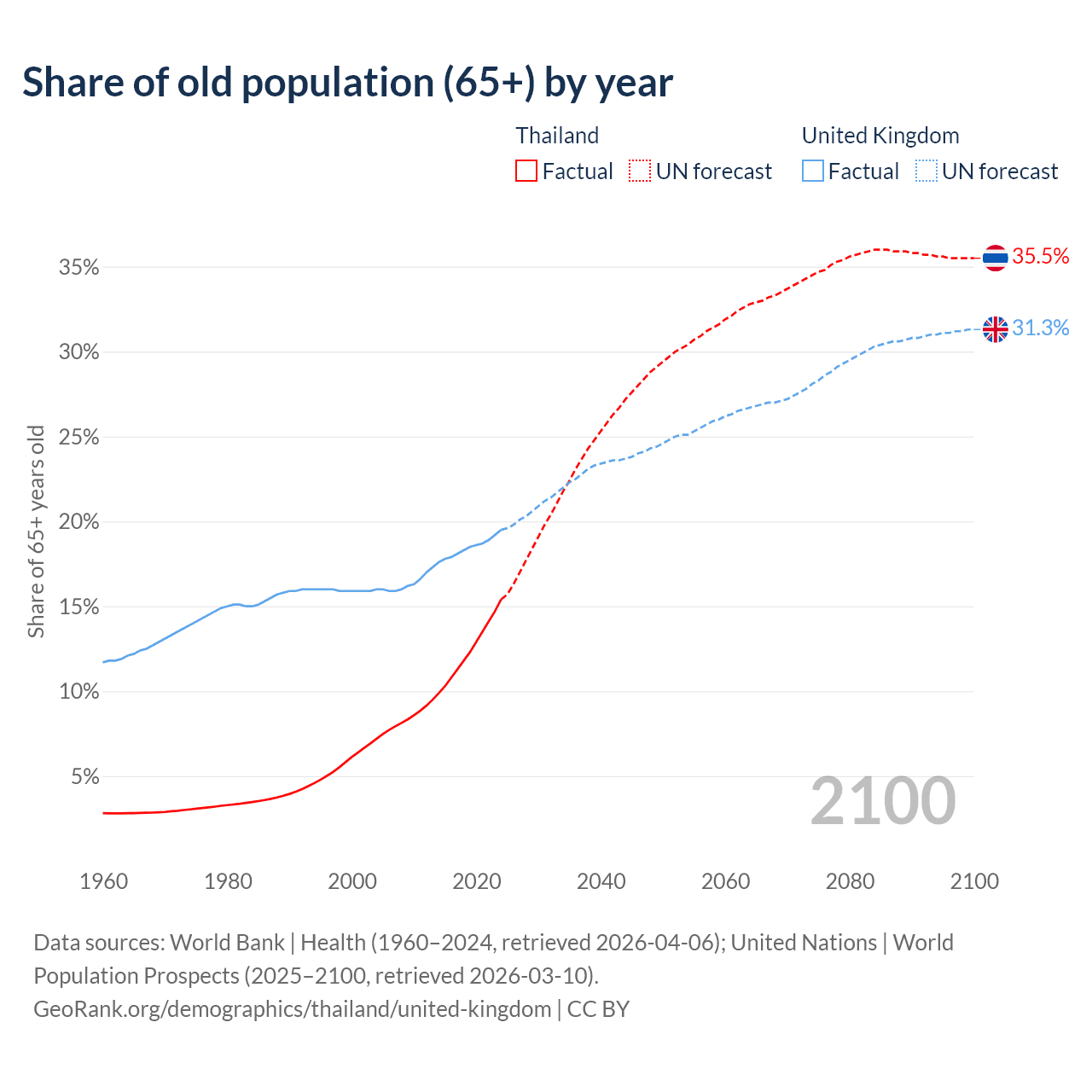 Median age Thailand vs United Kingdom, 1960-2100