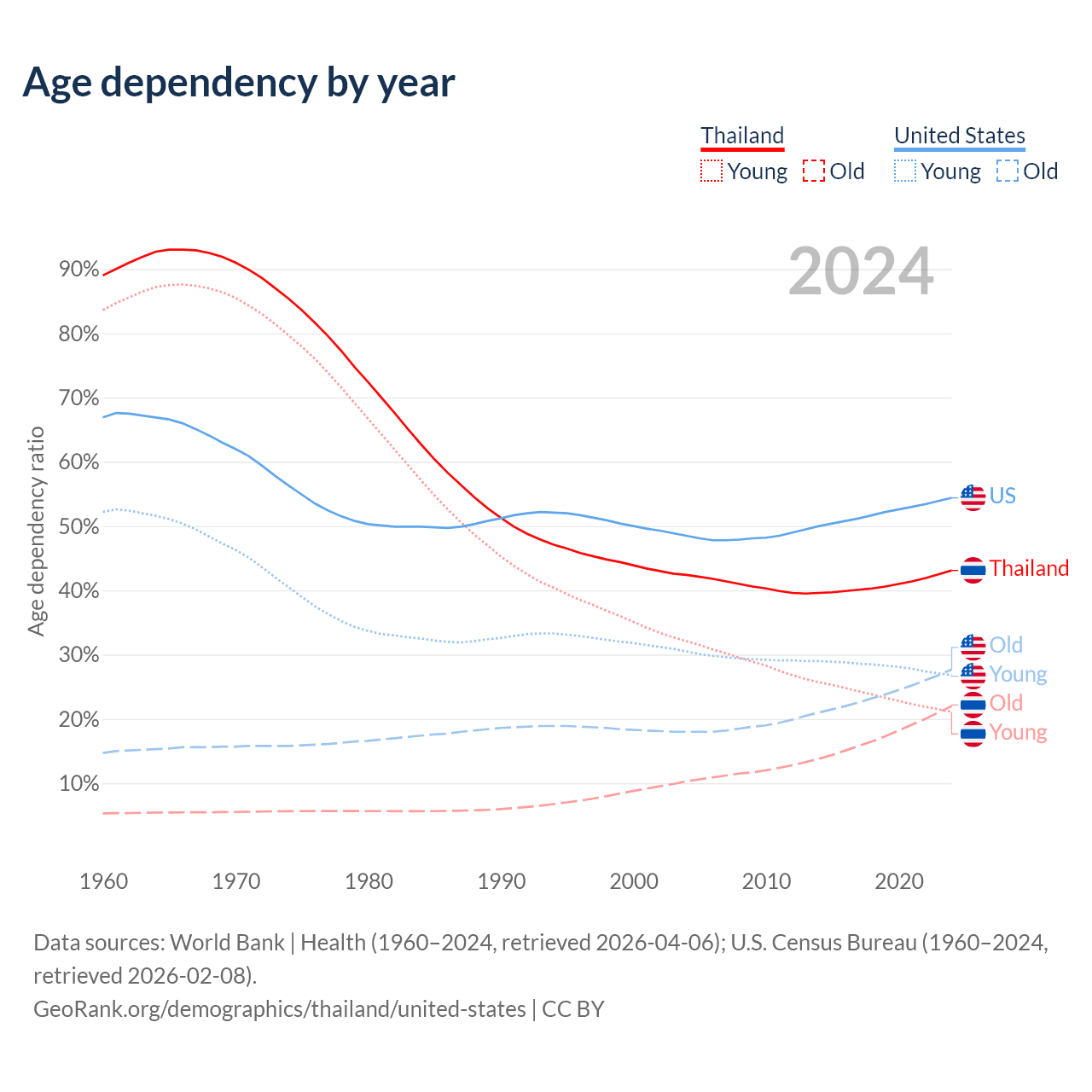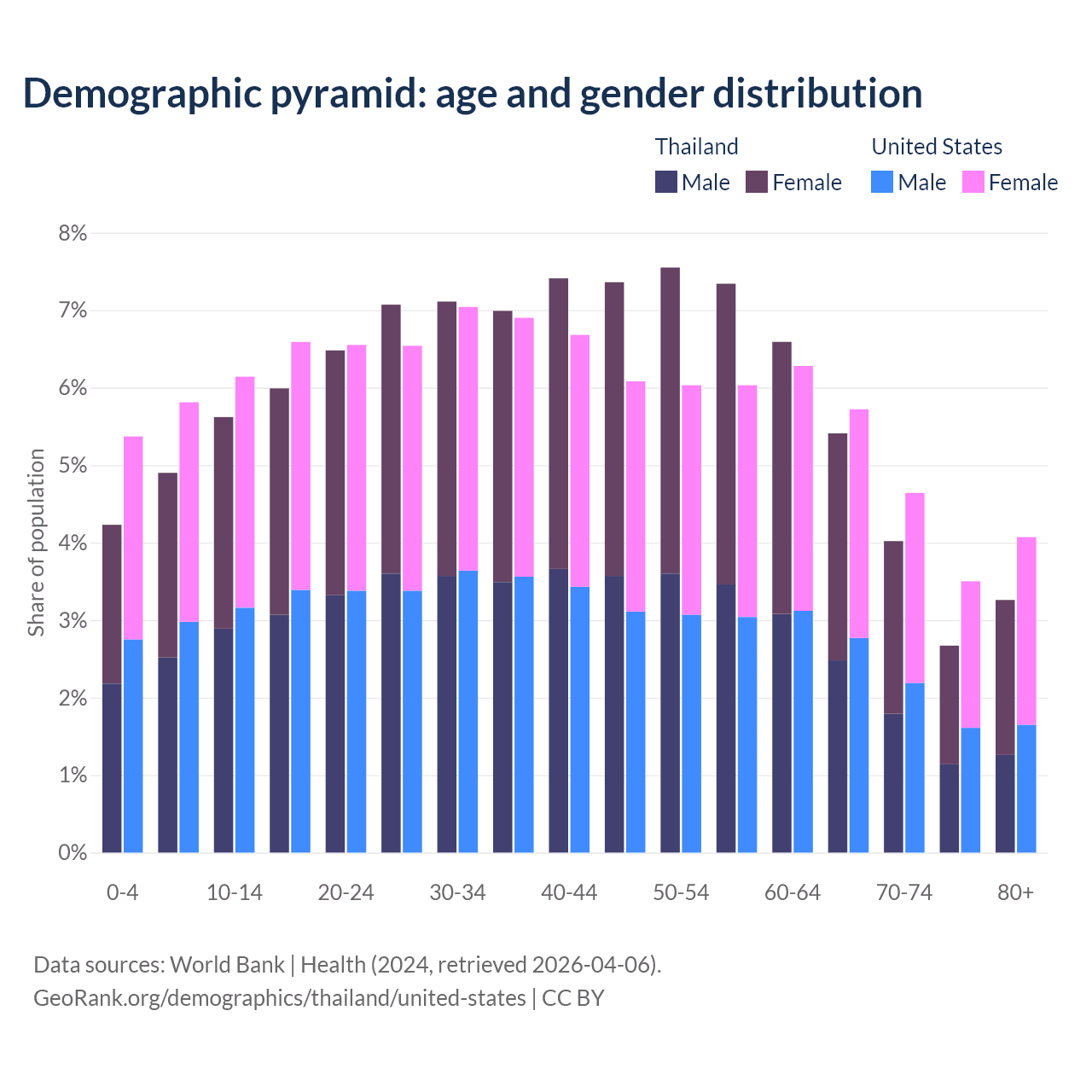 The share of older people aged 65 and over is 15.4% in Thailand and 17.9% in the United States. Life expectancy in Thailand compared to the United States .