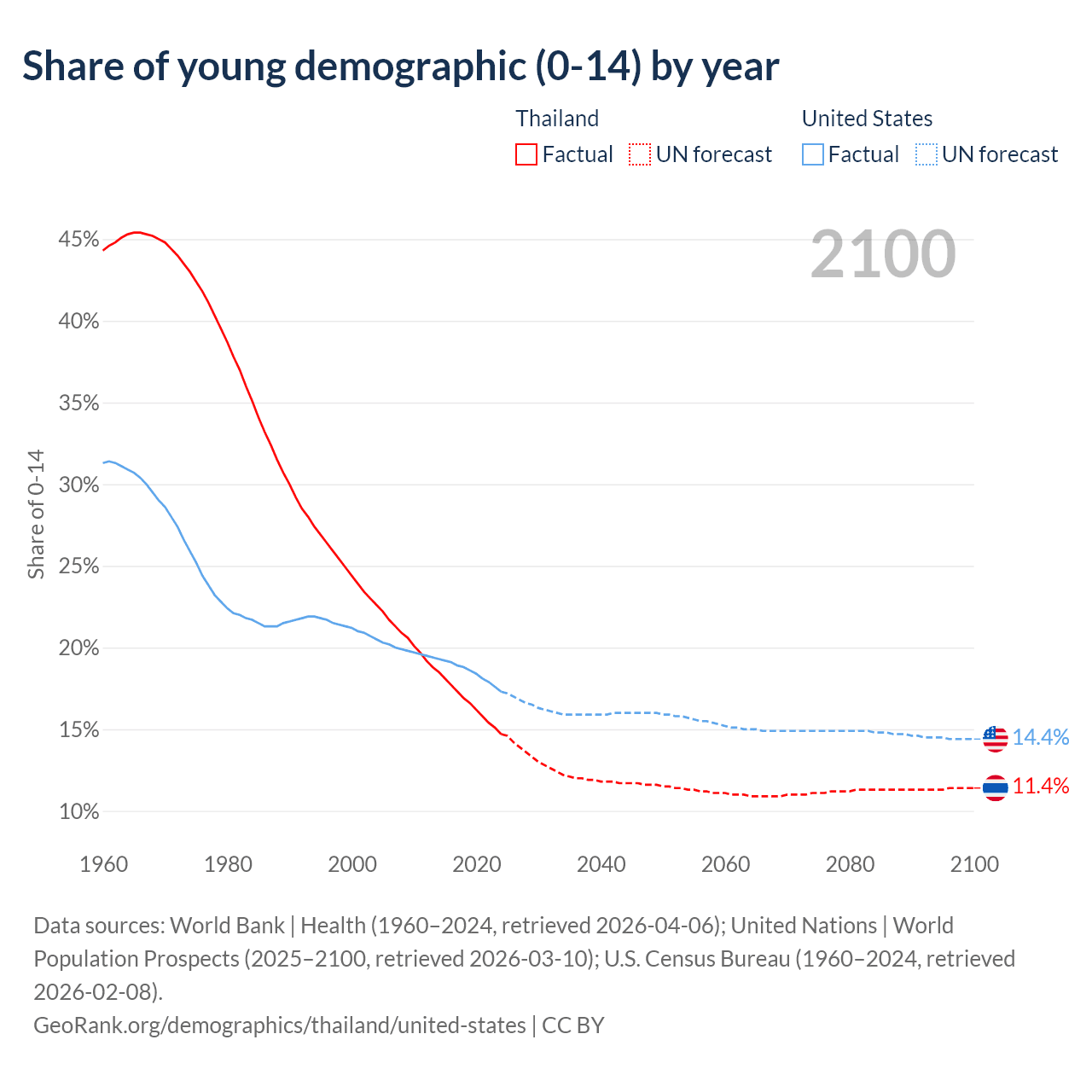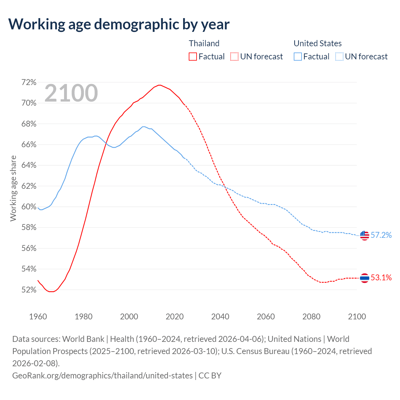 Median age Thailand vs United States, 1960-2100