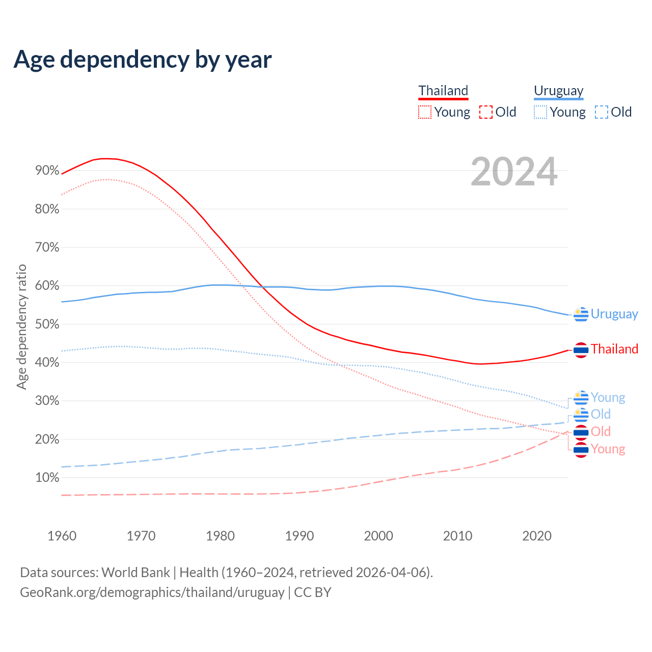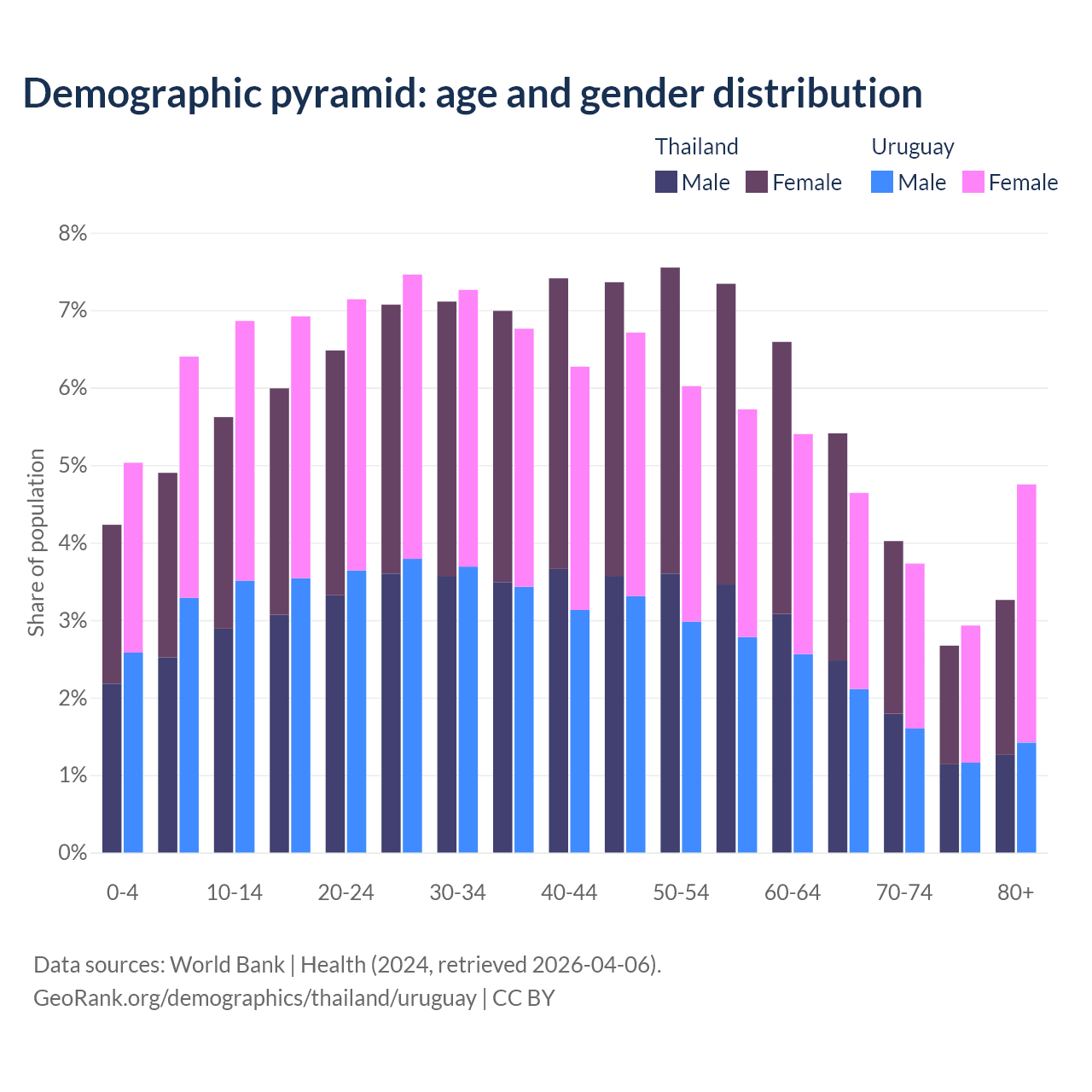 - Thailand is ranked 40/196 by median age (oldest to youngest) vs 63/196 for Uruguay.