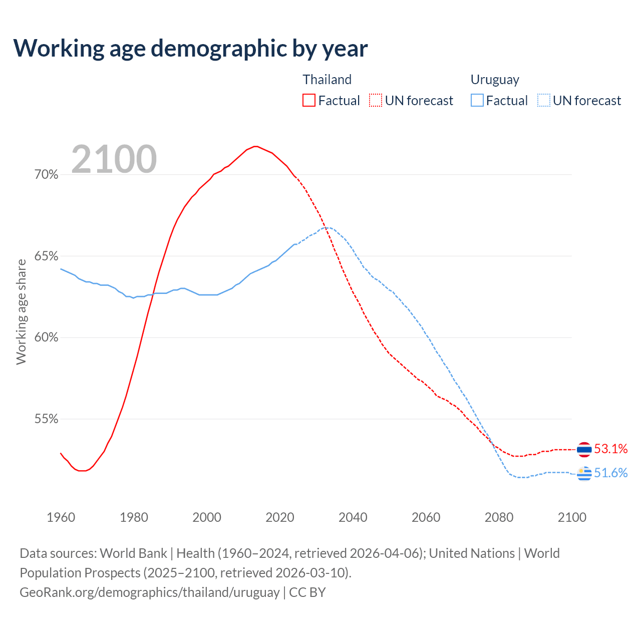 Median age Thailand vs Uruguay, 1960-2100