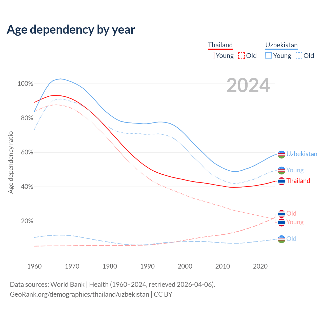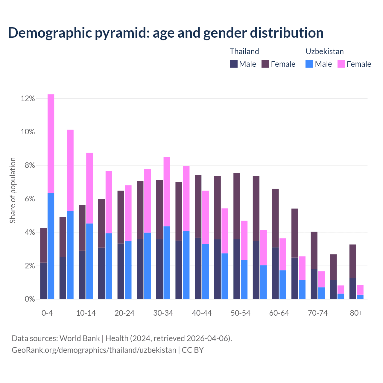 - Thailand is ranked 40/196 by median age (oldest to youngest) vs 116/196 for Uzbekistan.