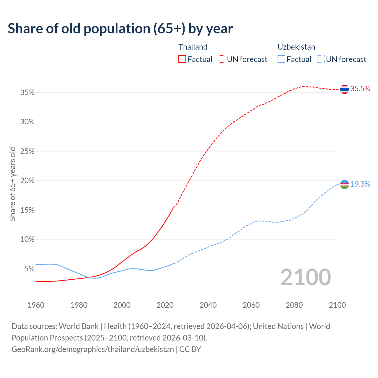 The share of older people aged 65 and over is 15.4% in Thailand and 5.86% in Uzbekistan. Life expectancy in Thailand compared to Uzbekistan .