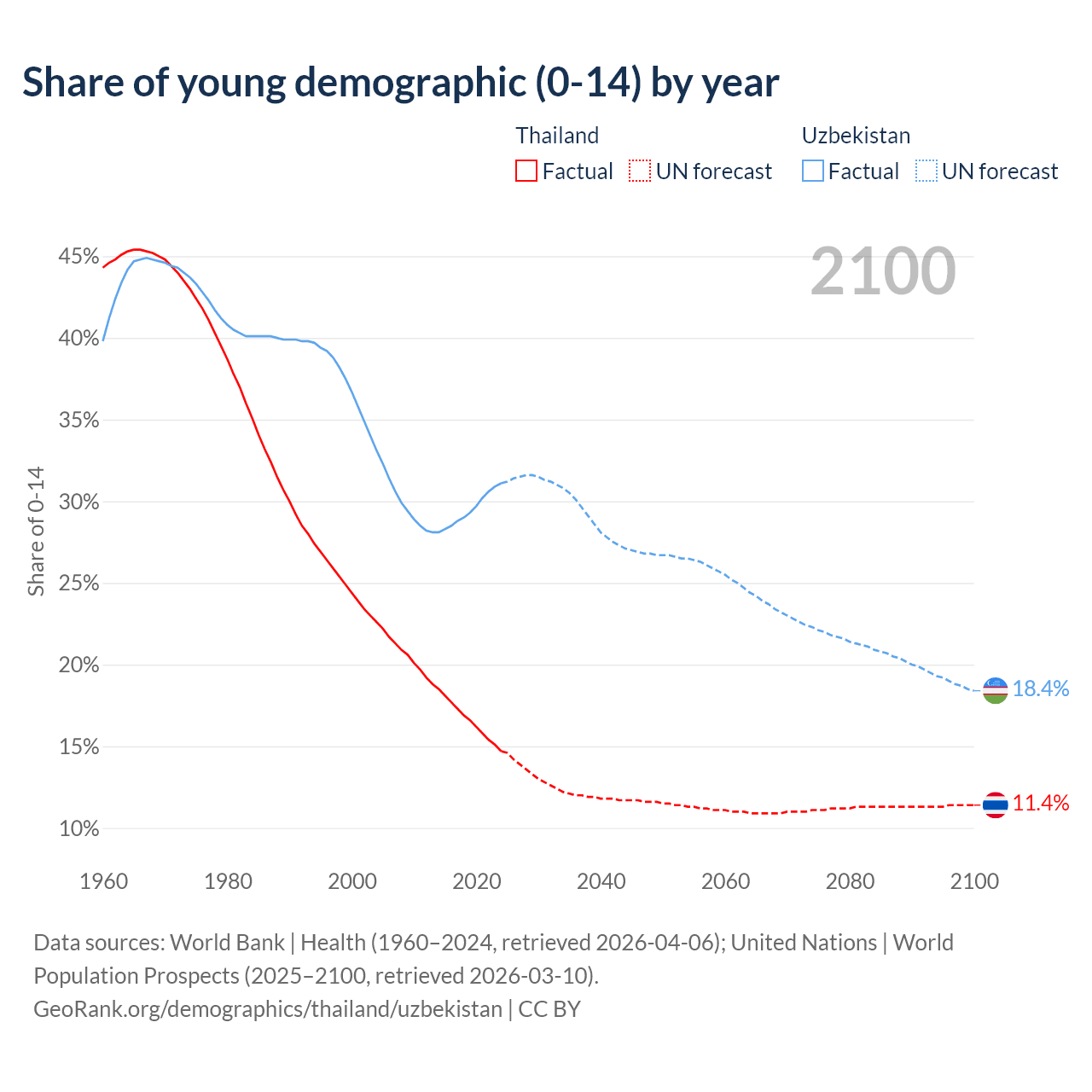 - The total fertility rate is 1.21 in Thailand compared to 3.5 in Uzbekistan.