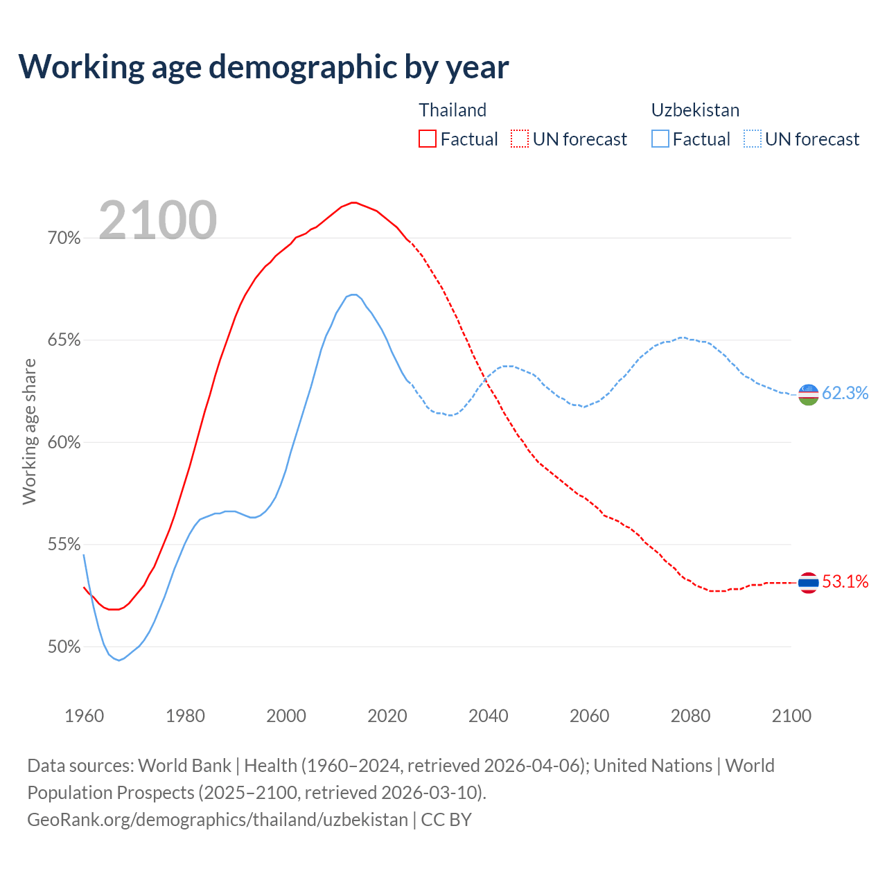 - Thailand has 50M working age adults (aged 15-64) vs 23.9M in Uzbekistan.
