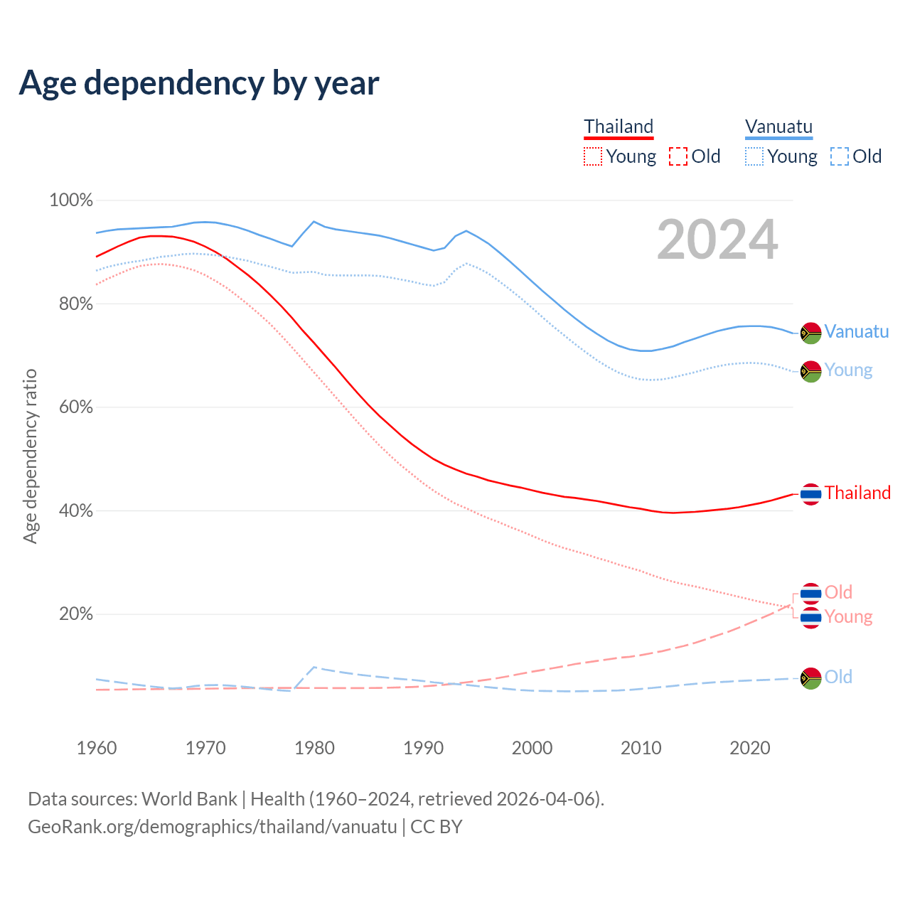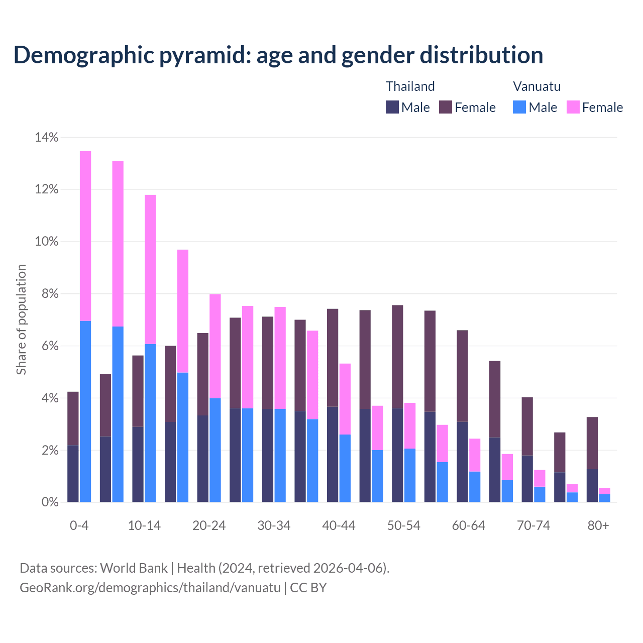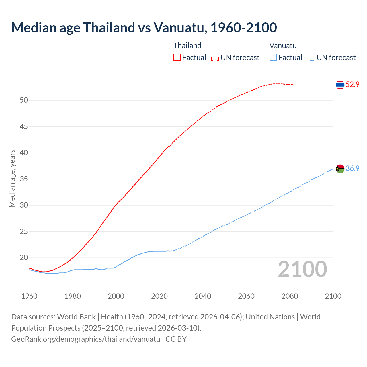 - Thailand is ranked 40/196 by median age (oldest to youngest) vs 156/196 for Vanuatu.