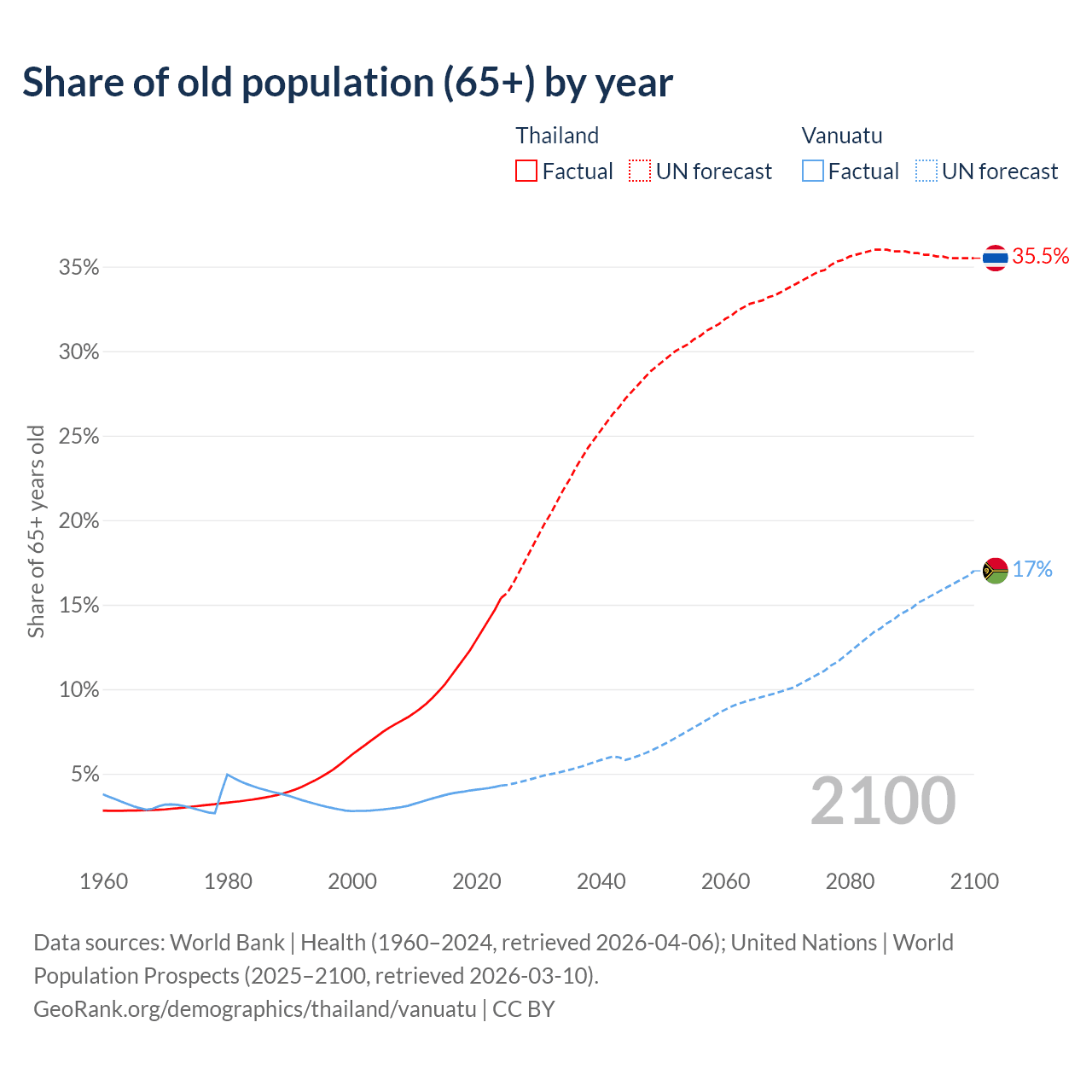 The share of older people aged 65 and over is 15.4% in Thailand and 4.3% in Vanuatu. Life expectancy in Thailand compared to Vanuatu .