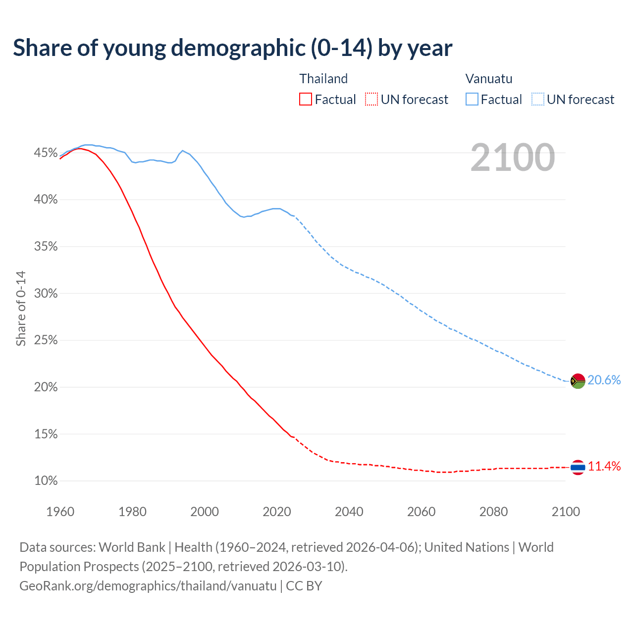 - The share of young demographic (0-15 years old) in Thailand is 14.7% vs 38.3% in Vanuatu.
