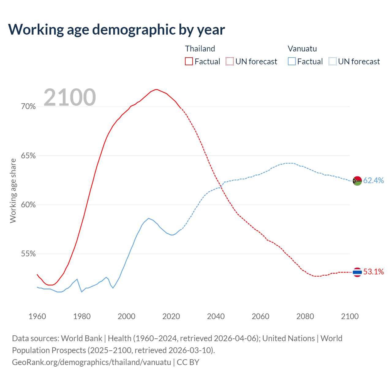 - Thailand has 50M working age adults (aged 15-64) vs 198K in Vanuatu.