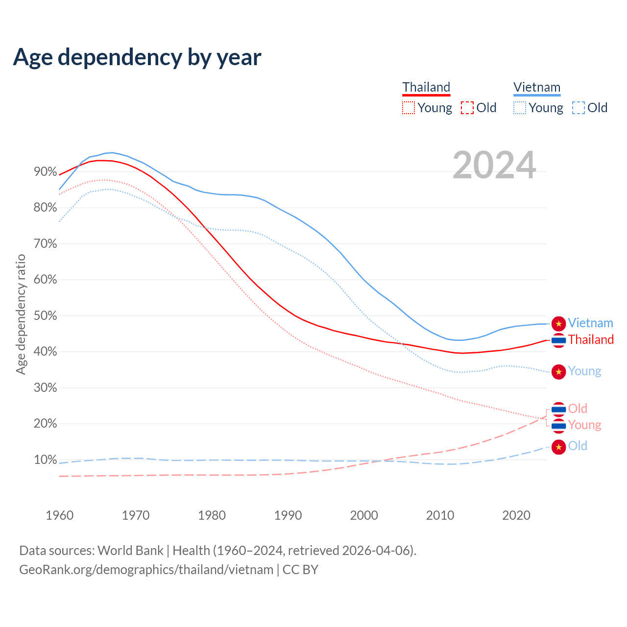 Data sources: World Bank | Health (1960–2024, retrieved 2026-04-06); U.S. Census Bureau (1960–2024, retrieved 2026-02-08).