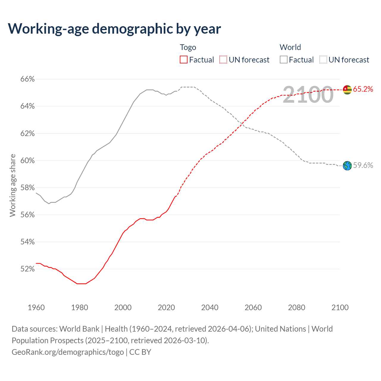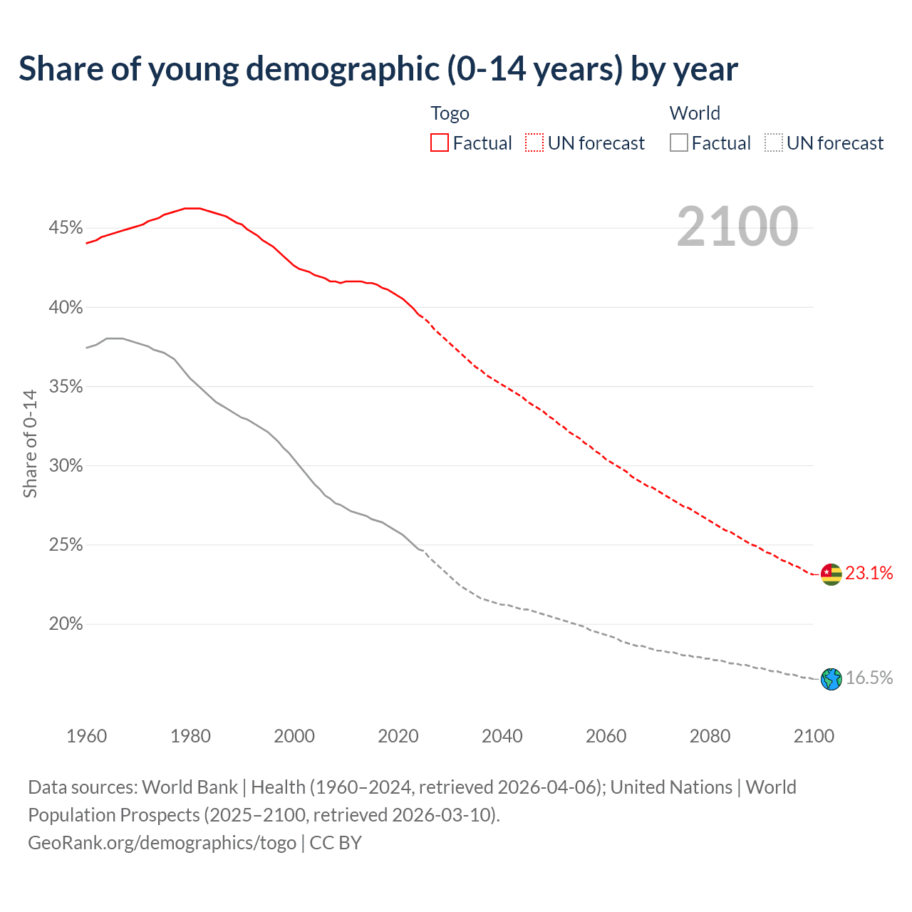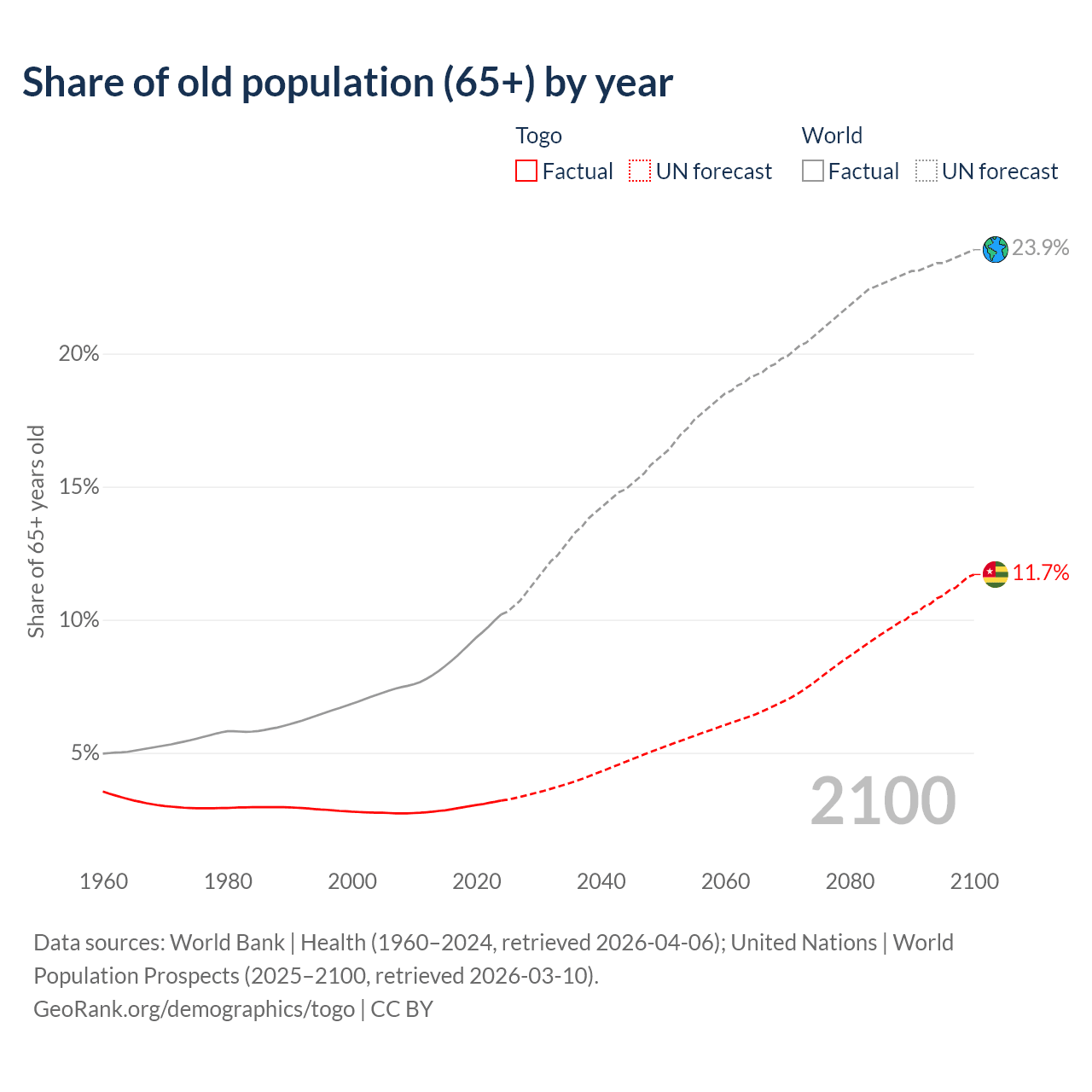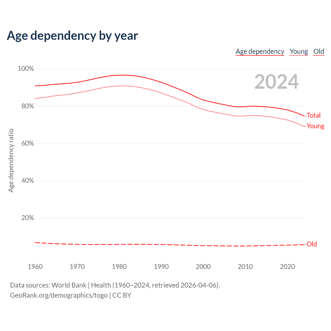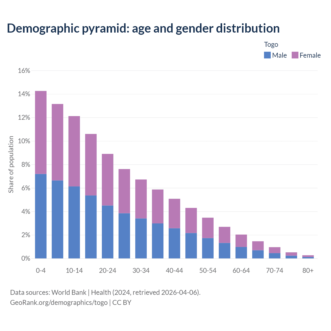 With a population of 9.52M people, Togo has a median age of 19.9 years which makes it the 166/196 oldest country. 39.5% of the demographic are children 0-14 years old, 57.3% are working-age people aged 15-64, and 3.21% are older population aged 65+ years.