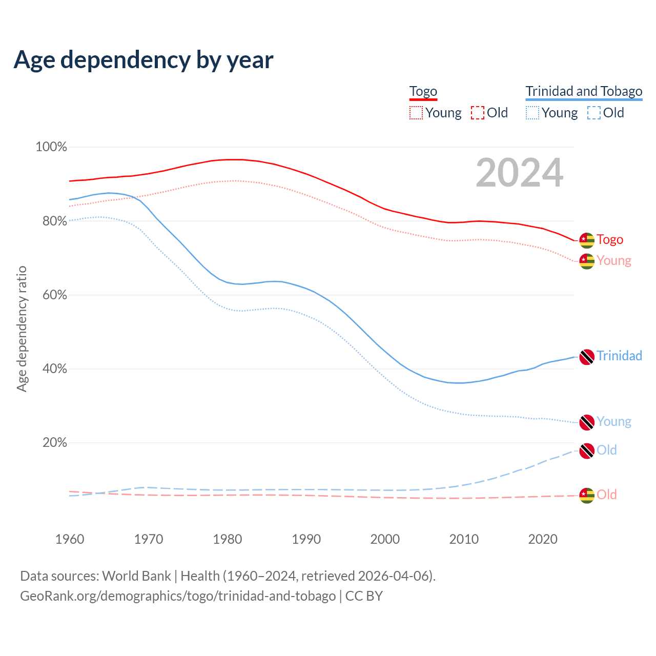 - The share of old-age demographic (65+) in Togo is 3.21% vs 12.4% in Trinidad and Tobago.