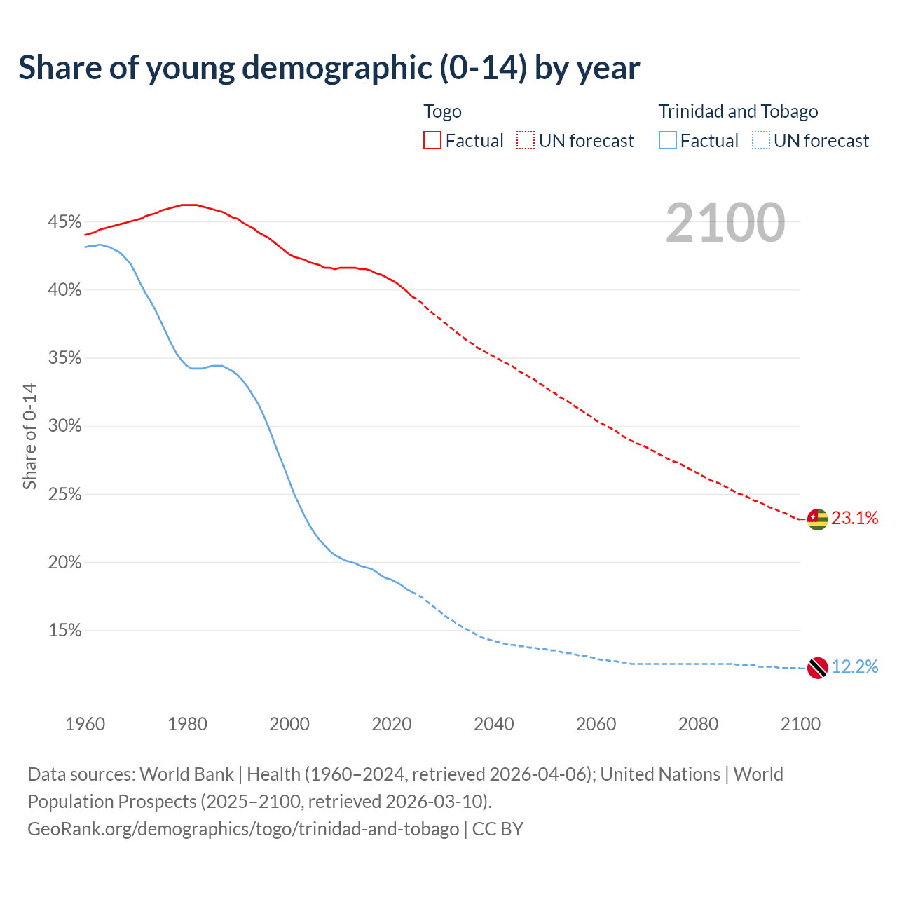 - The share of young demographic (0-15 years old) in Togo is 39.5% vs 17.8% in Trinidad and Tobago.
