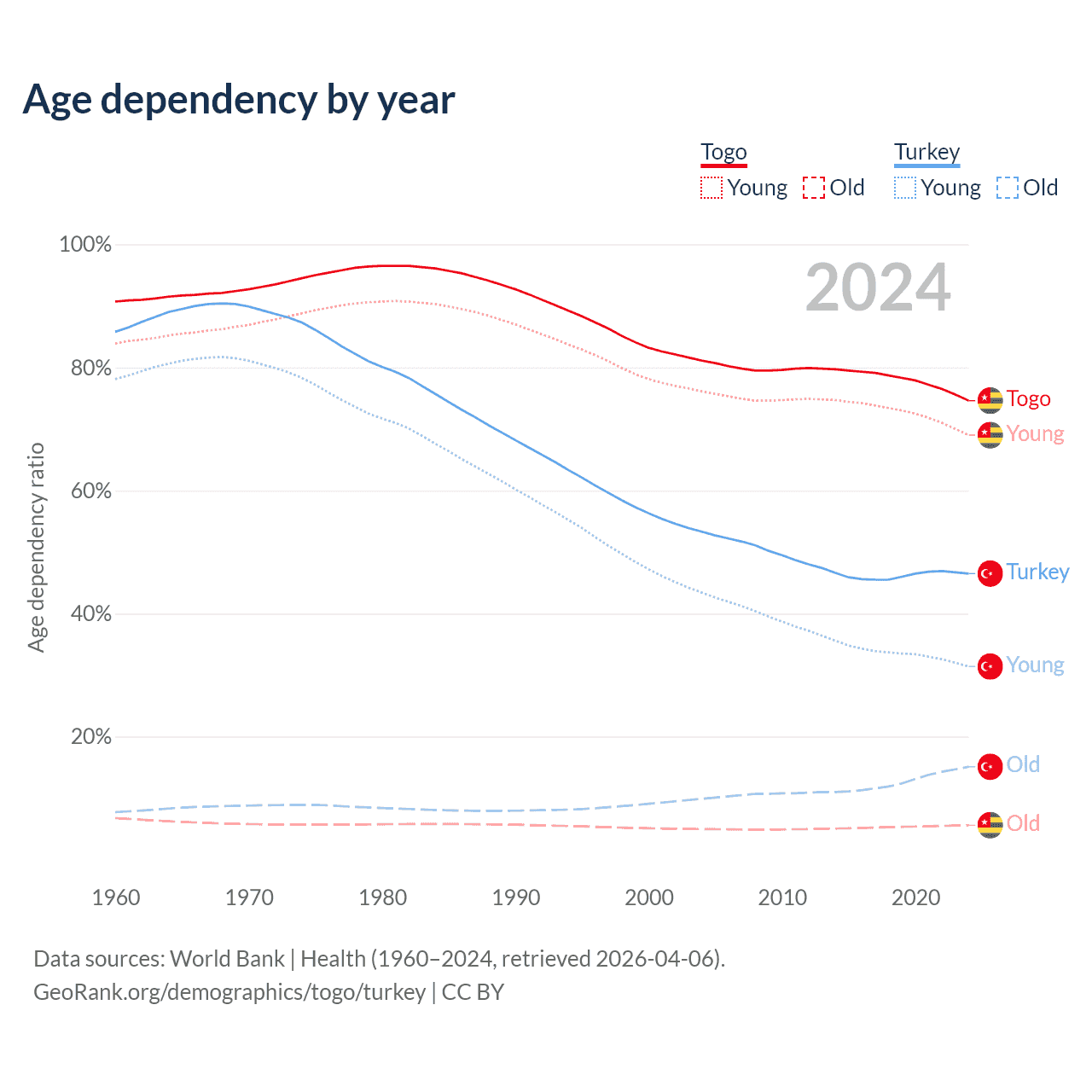 - Togo is ranked 166/196 by median age (oldest to youngest) vs 83/196 for Turkey.