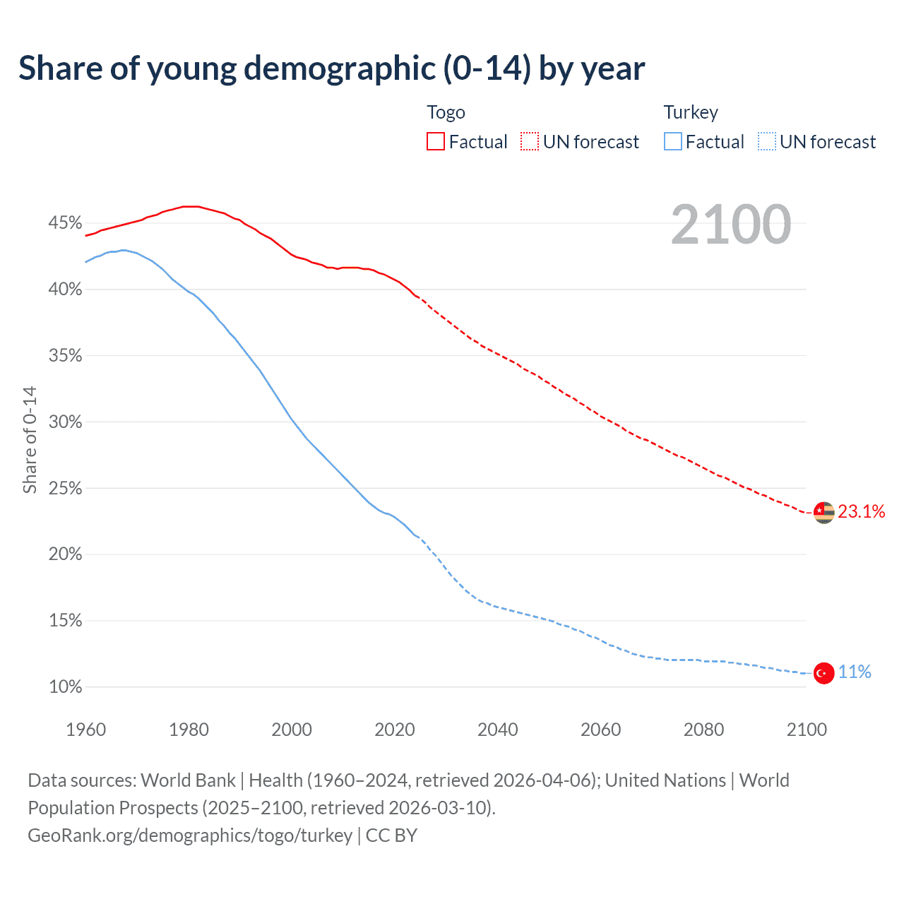 - The share of young demographic (0-15 years old) in Togo is 39.5% vs 21.4% in Turkey.