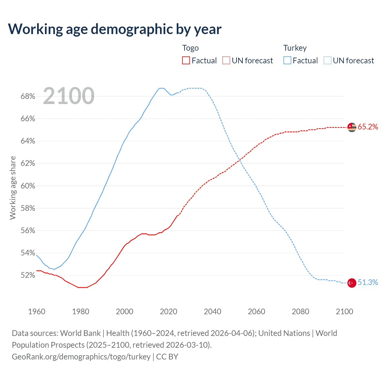 - Togo has 5.72M working age adults (aged 15-64) vs 58.7M in Turkey.