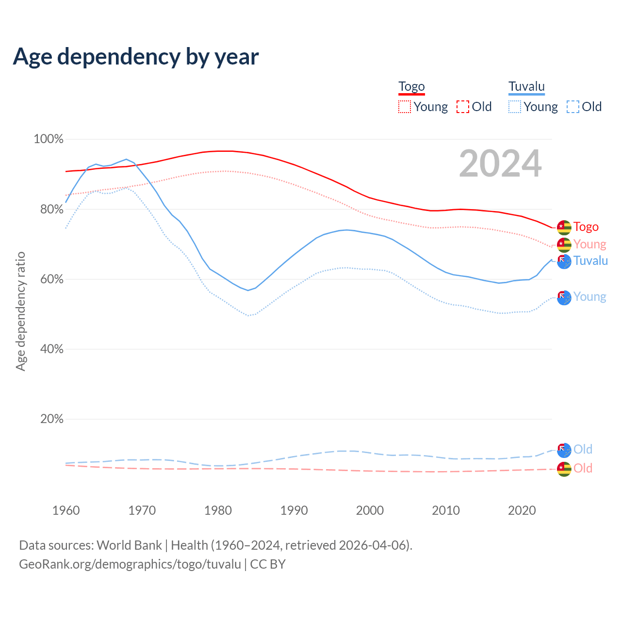 - The share of old-age demographic (65+) in Togo is 3.21% vs 6.67% in Tuvalu.