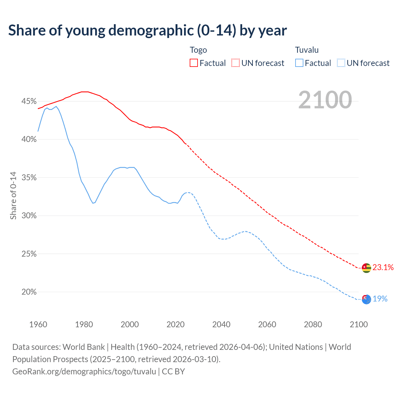 - The share of young demographic (0-15 years old) in Togo is 39.5% vs 32.9% in Tuvalu.