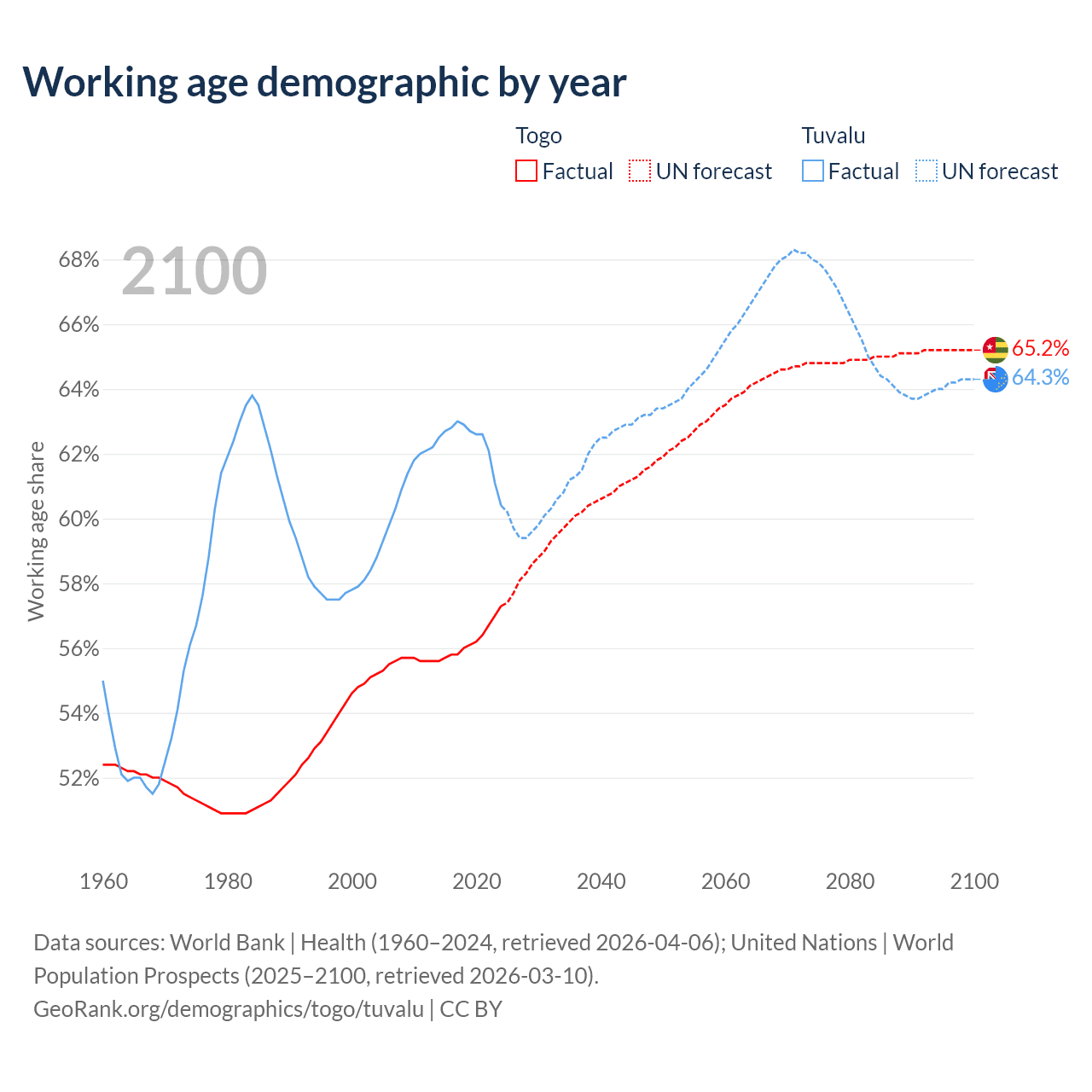 - Togo has 5.72M working age adults (aged 15-64) vs 5.64K in Tuvalu.