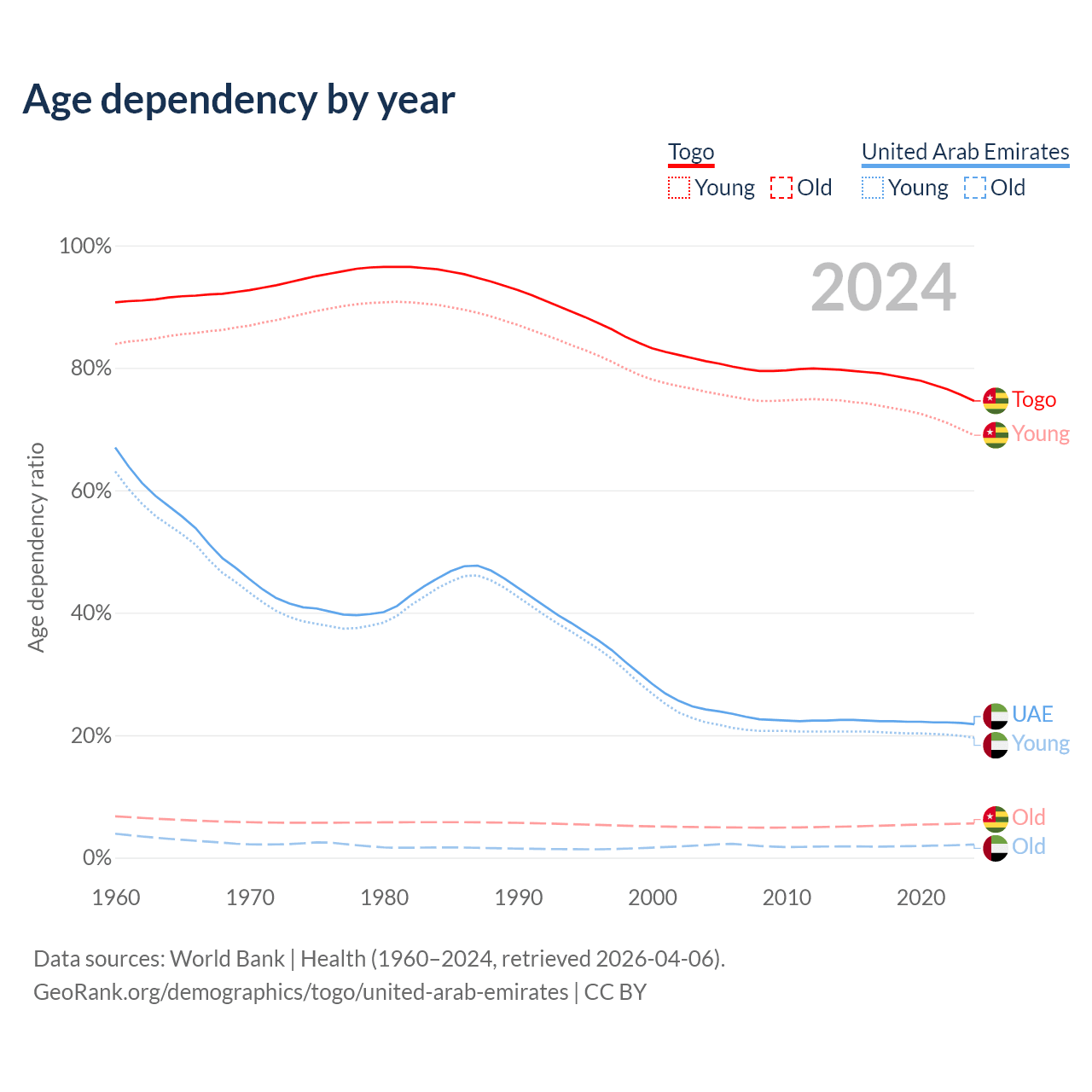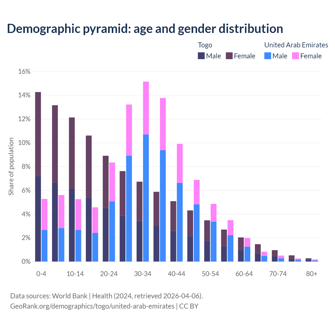 - The share of young demographic (0-15 years old) in Togo is 39.5% vs 16.1% in the United Arab Emirates.