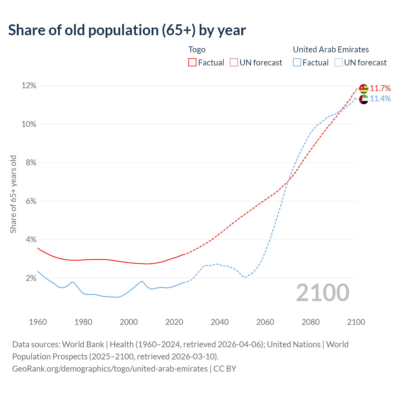 - The share of old-age demographic (65+) in Togo is 3.21% vs 1.77% in the United Arab Emirates.