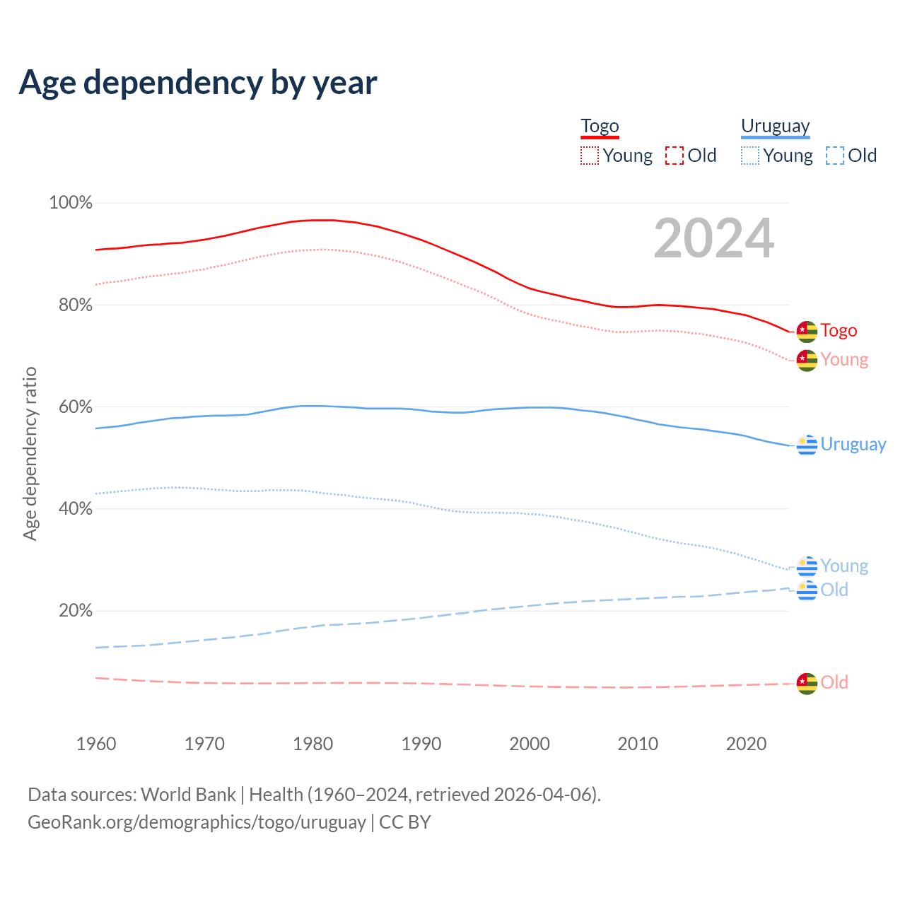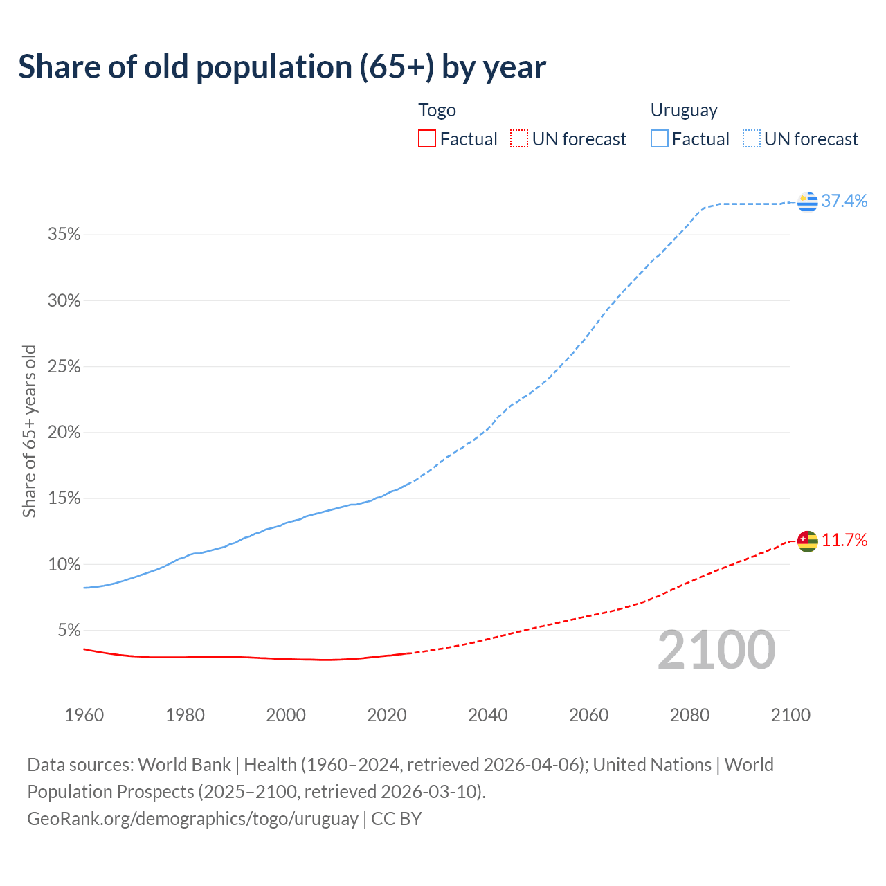 The share of older people aged 65 and over is 3.21% in Togo and 16% in Uruguay. Life expectancy in Togo compared to Uruguay .