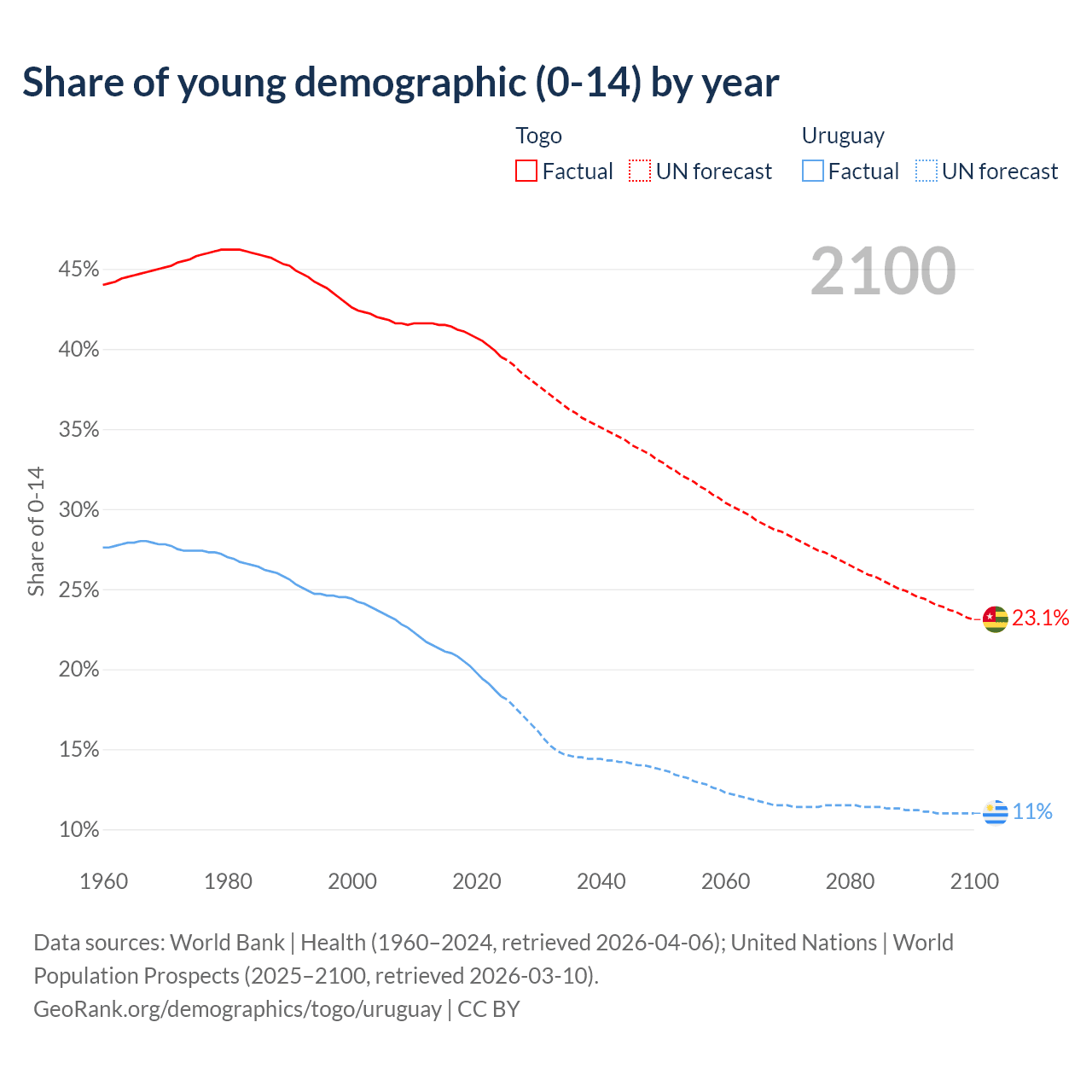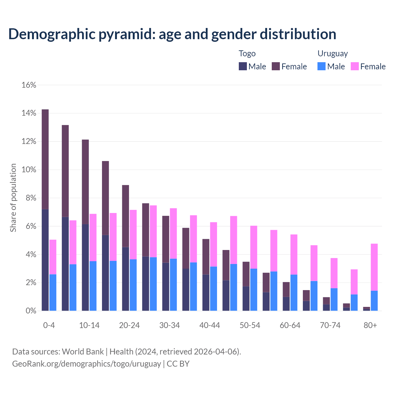 - The share of young demographic (0-15 years old) in Togo is 39.5% vs 18.3% in Uruguay.