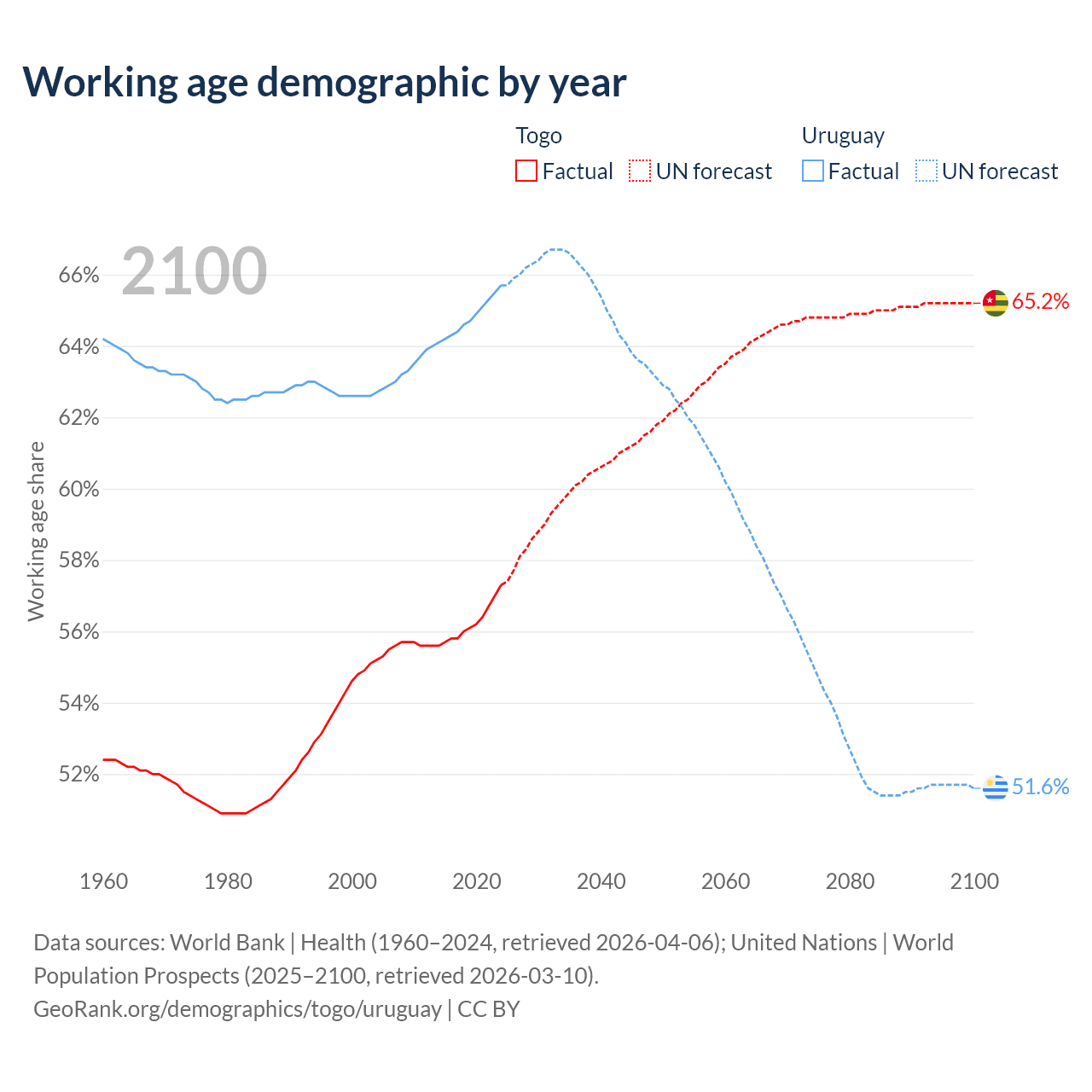- Togo has 5.72M working age adults (aged 15-64) vs 2.22M in Uruguay.