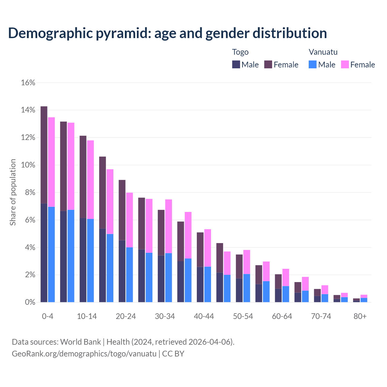 - Togo is ranked 166/196 by median age (oldest to youngest) vs 156/196 for Vanuatu.