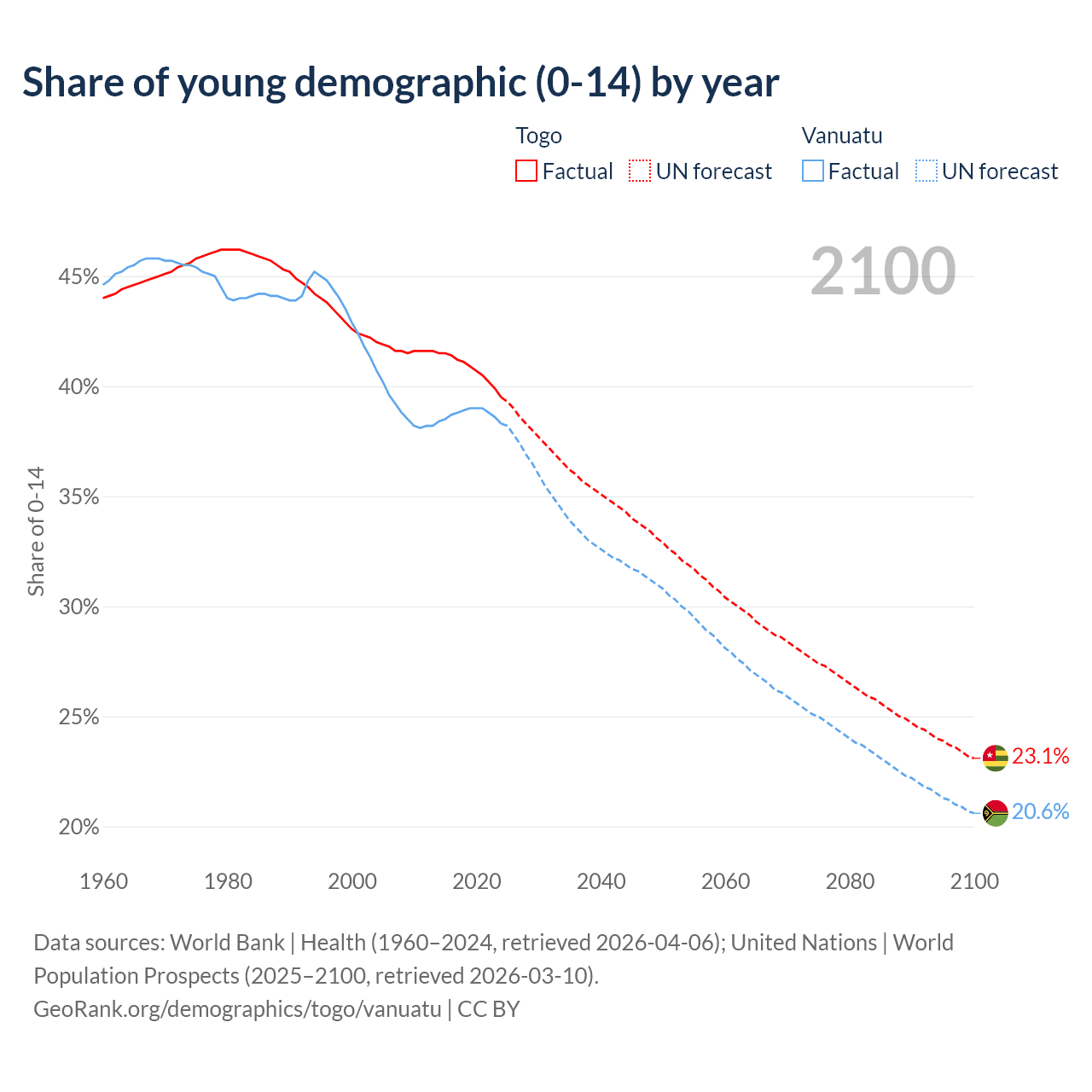 - The share of young demographic (0-15 years old) in Togo is 39.5% vs 38.3% in Vanuatu.