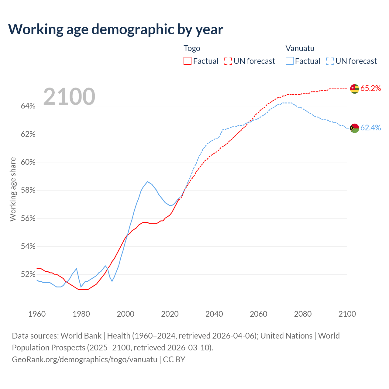 - Togo has 5.72M working age adults (aged 15-64) vs 198K in Vanuatu.