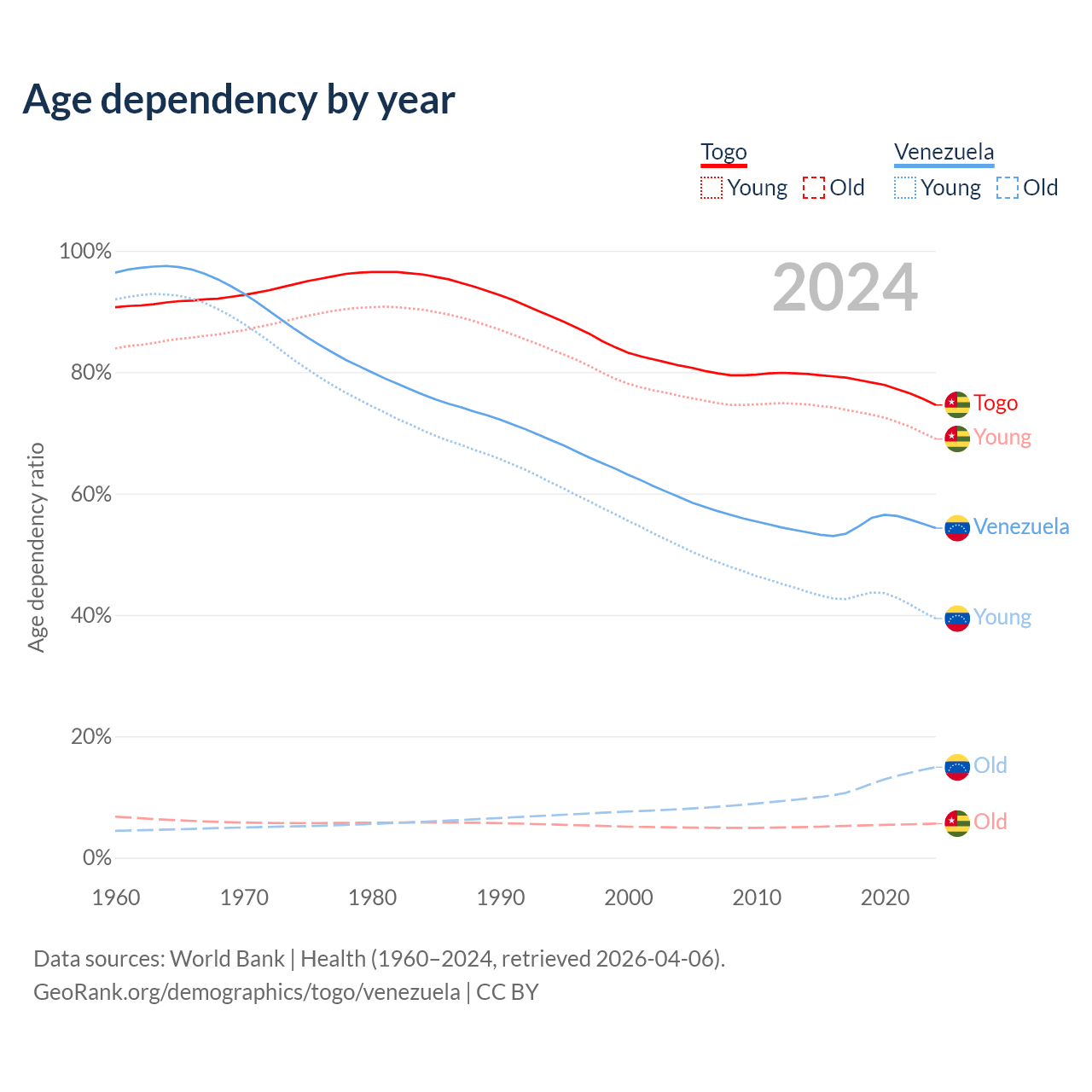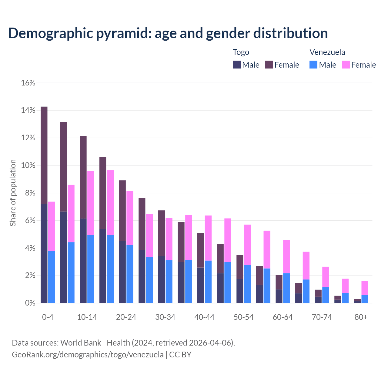 - Togo is ranked 166/196 by median age (oldest to youngest) vs 104/196 for Venezuela.