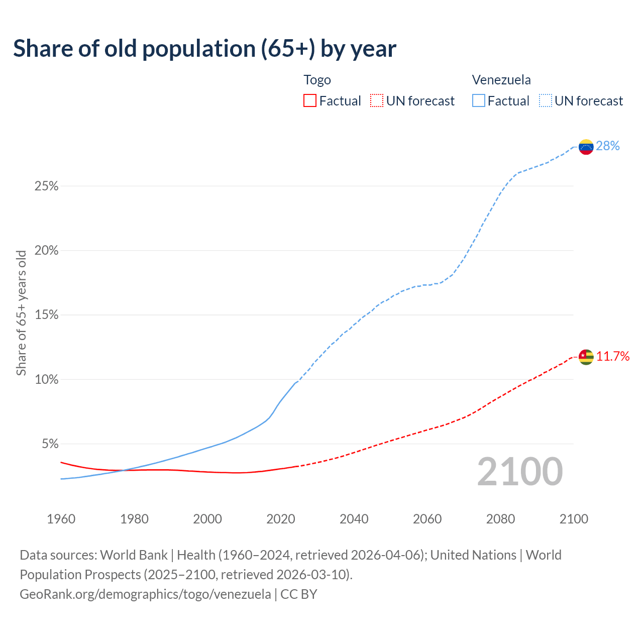 - The share of old-age demographic (65+) in Togo is 3.21% vs 9.68% in Venezuela.