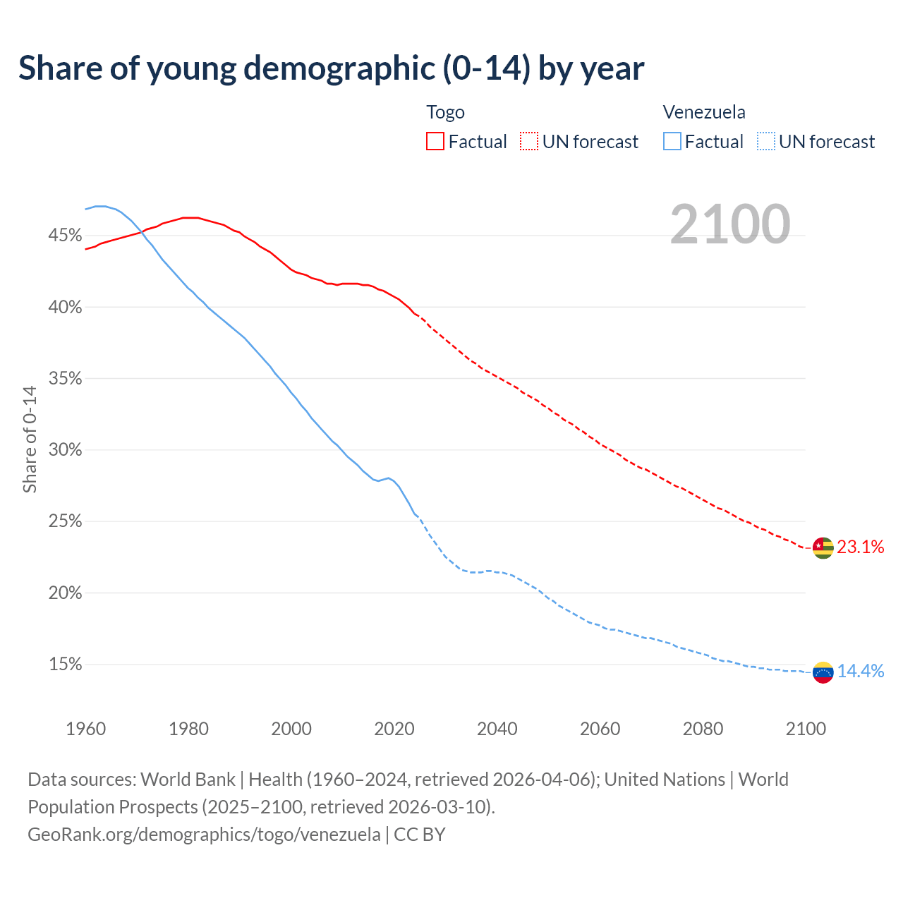 - The share of young demographic (0-15 years old) in Togo is 39.5% vs 25.5% in Venezuela.