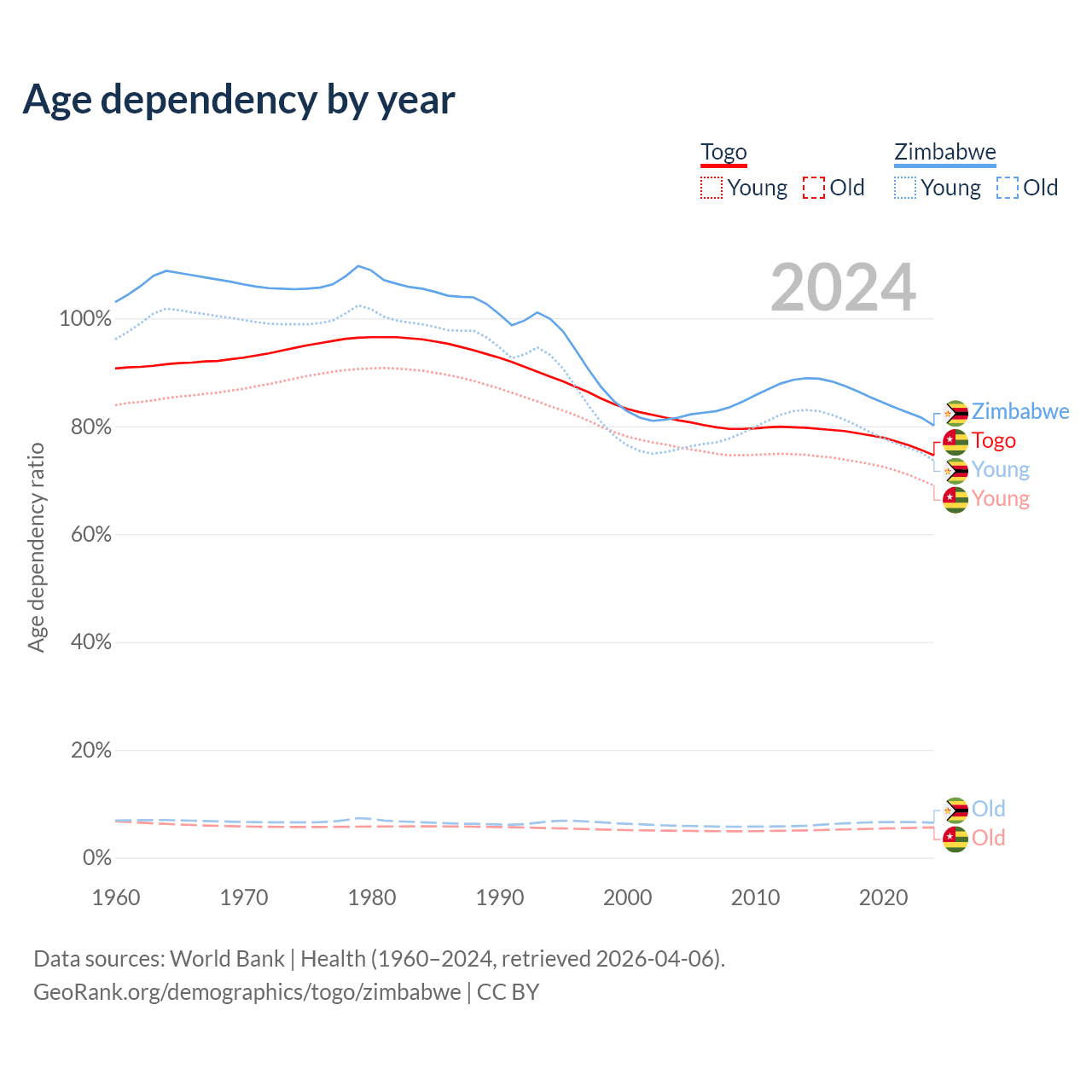 - Togo is ranked 166/196 by median age (oldest to youngest) vs 177/196 for Zimbabwe.