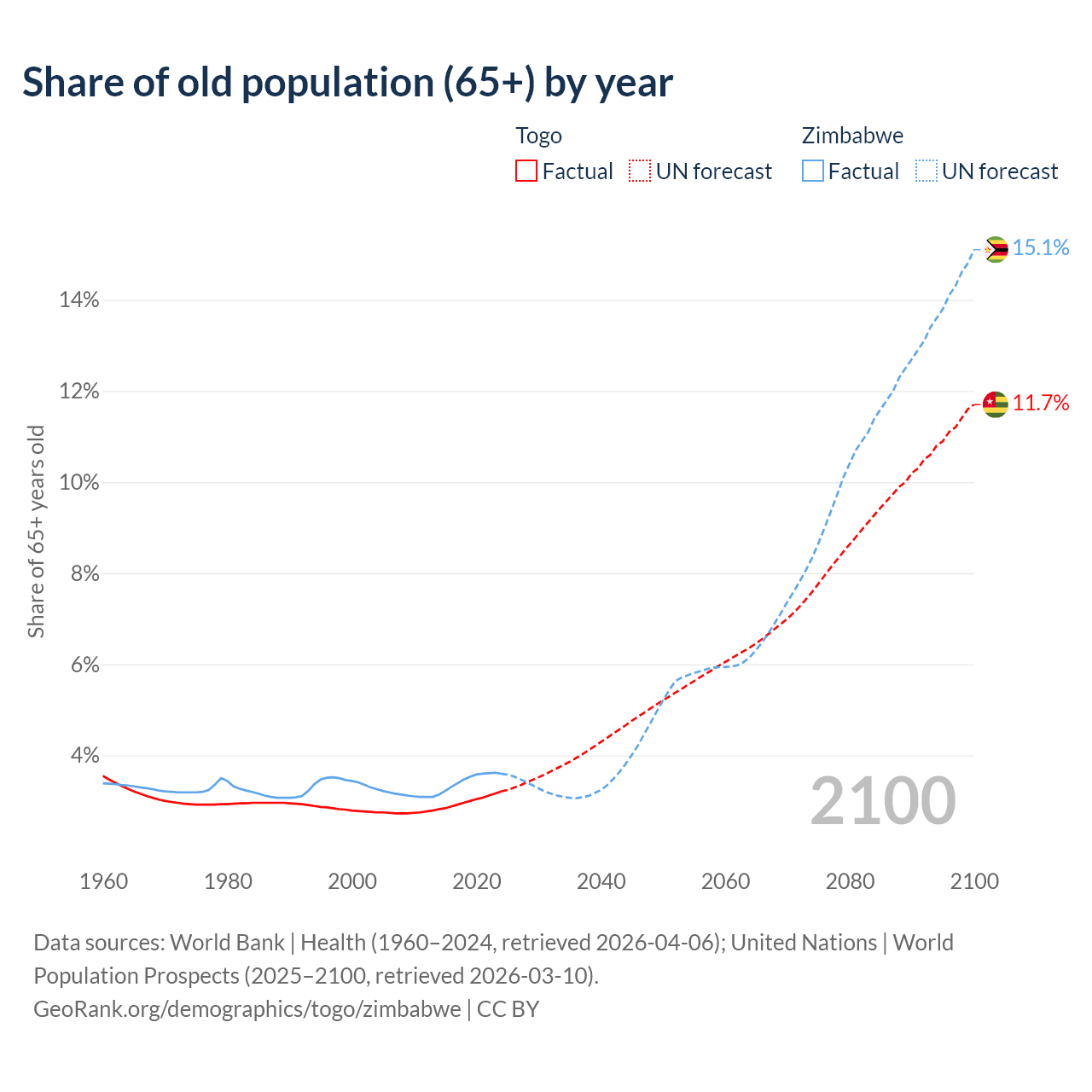 - The share of old-age demographic (65+) in Togo is 3.21% vs 3.6% in Zimbabwe.