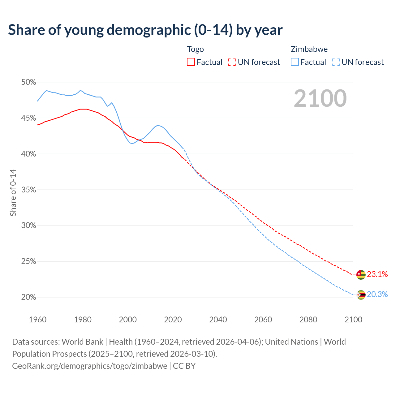 - The share of young demographic (0-15 years old) in Togo is 39.5% vs 40.9% in Zimbabwe.