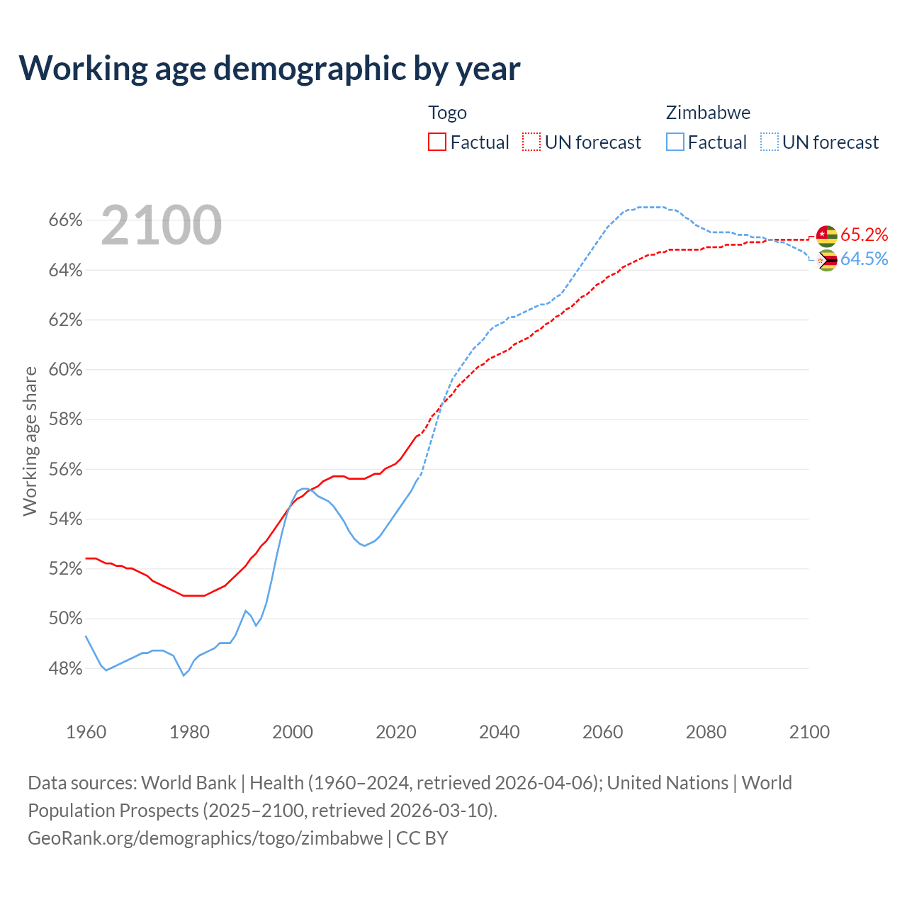 - Togo has 5.72M working age adults (aged 15-64) vs 9.64M in Zimbabwe.
