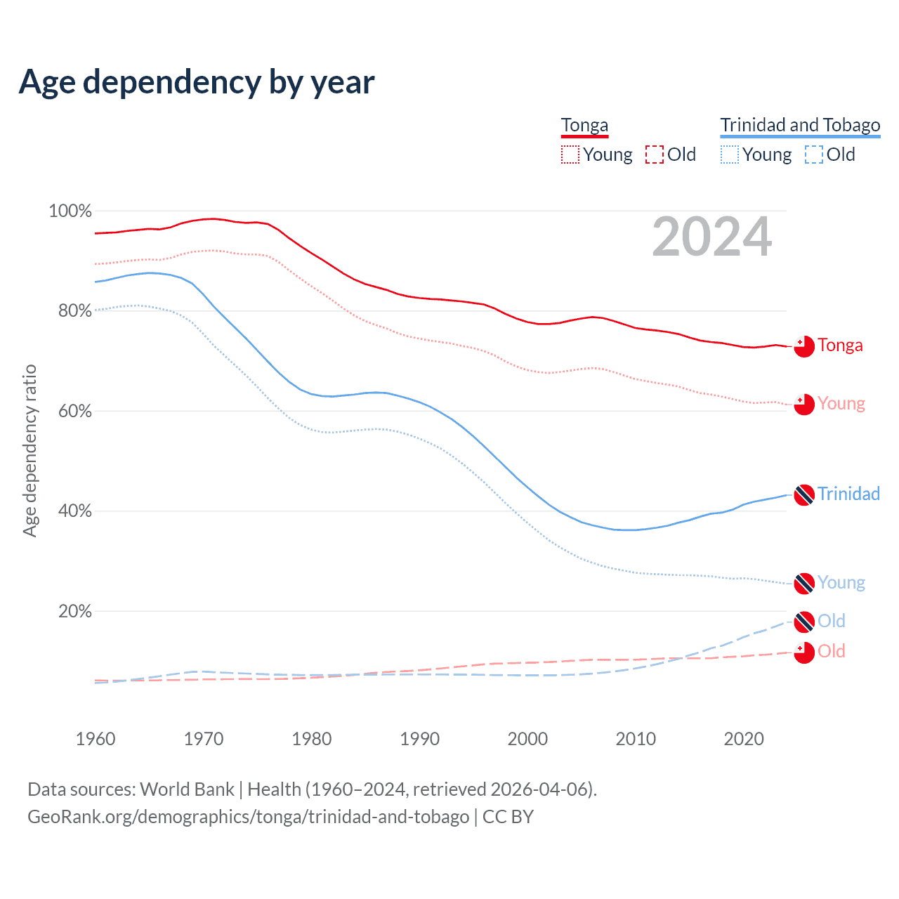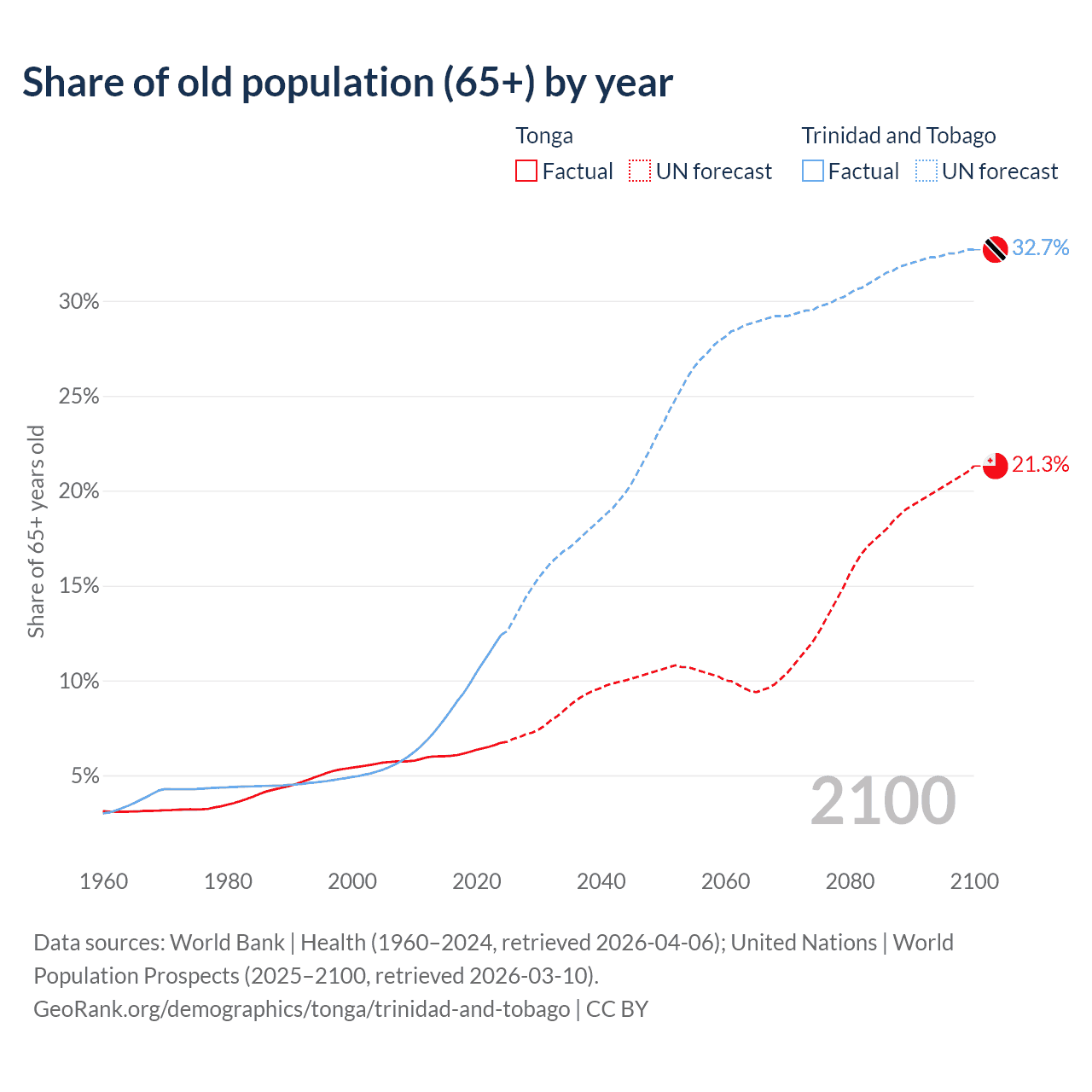 - The share of old-age demographic (65+) in Tonga is 6.72% vs 12.4% in Trinidad and Tobago.