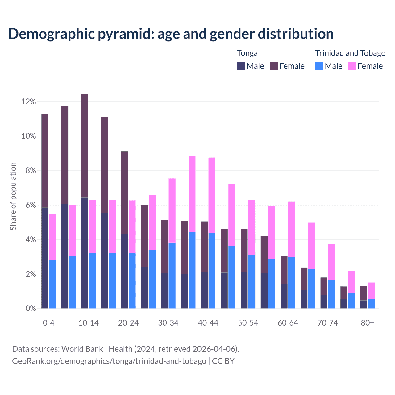 - Tonga is ranked 149/196 by median age (oldest to youngest) vs 58/196 for Trinidad and Tobago.