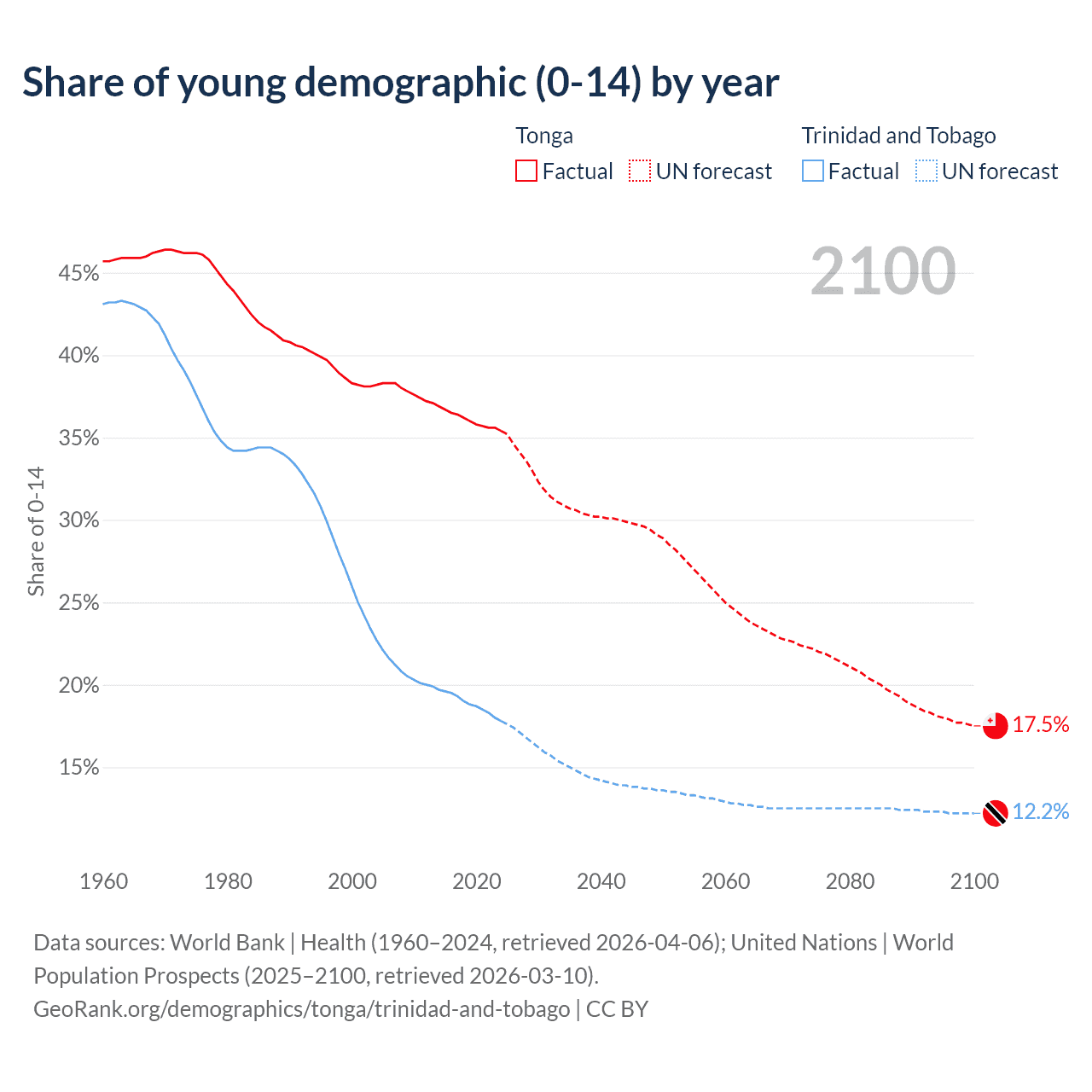 - The share of young demographic (0-15 years old) in Tonga is 35.4% vs 17.8% in Trinidad and Tobago.