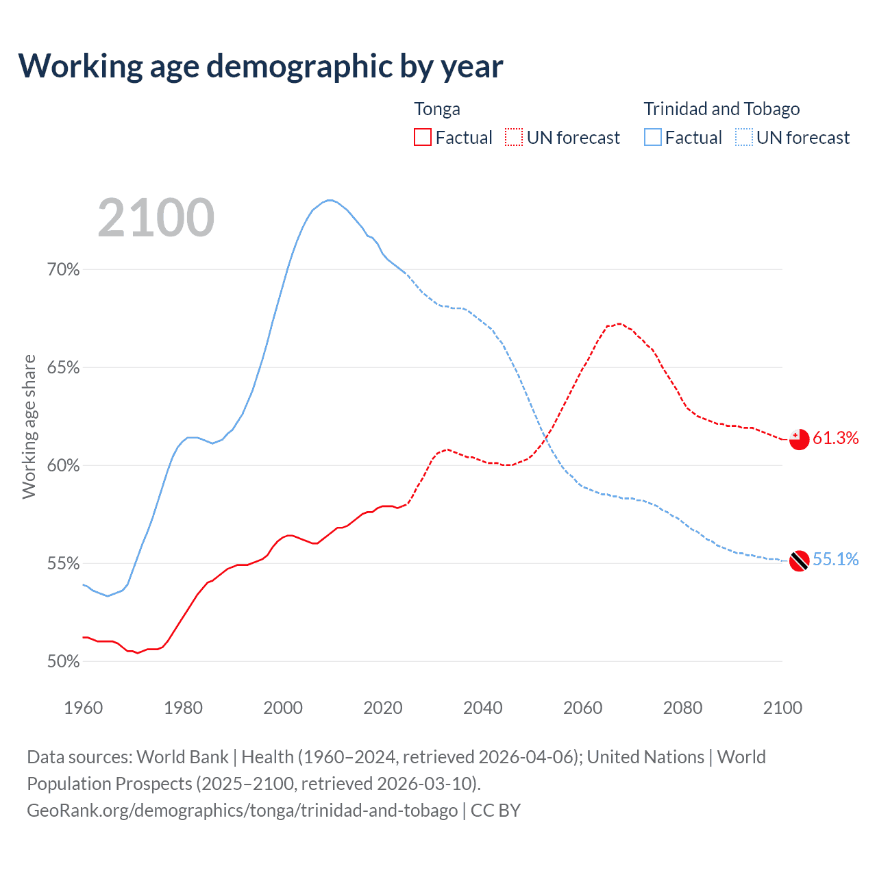 - Tonga has 59.8K working age adults (aged 15-64) vs 960K in Trinidad and Tobago.