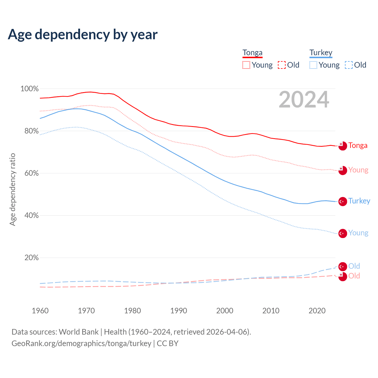 - Tonga is ranked 149/196 by median age (oldest to youngest) vs 83/196 for Turkey.