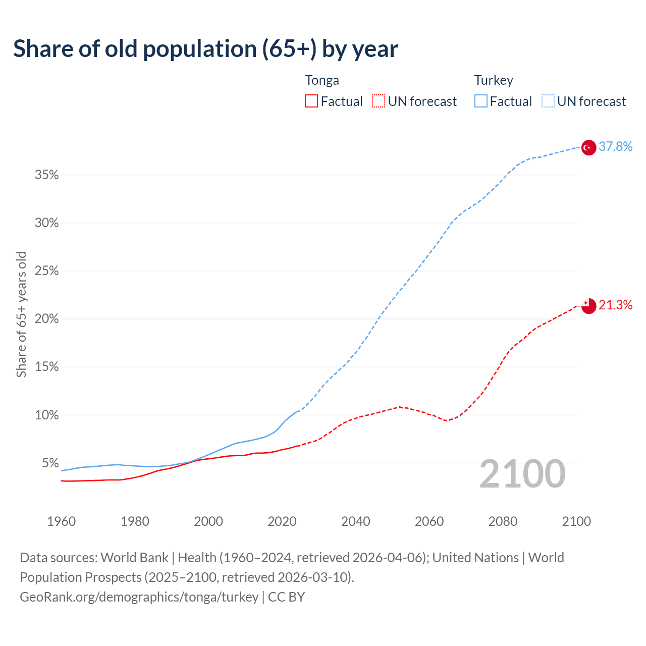 - The share of old-age demographic (65+) in Tonga is 6.72% vs 10.3% in Turkey.