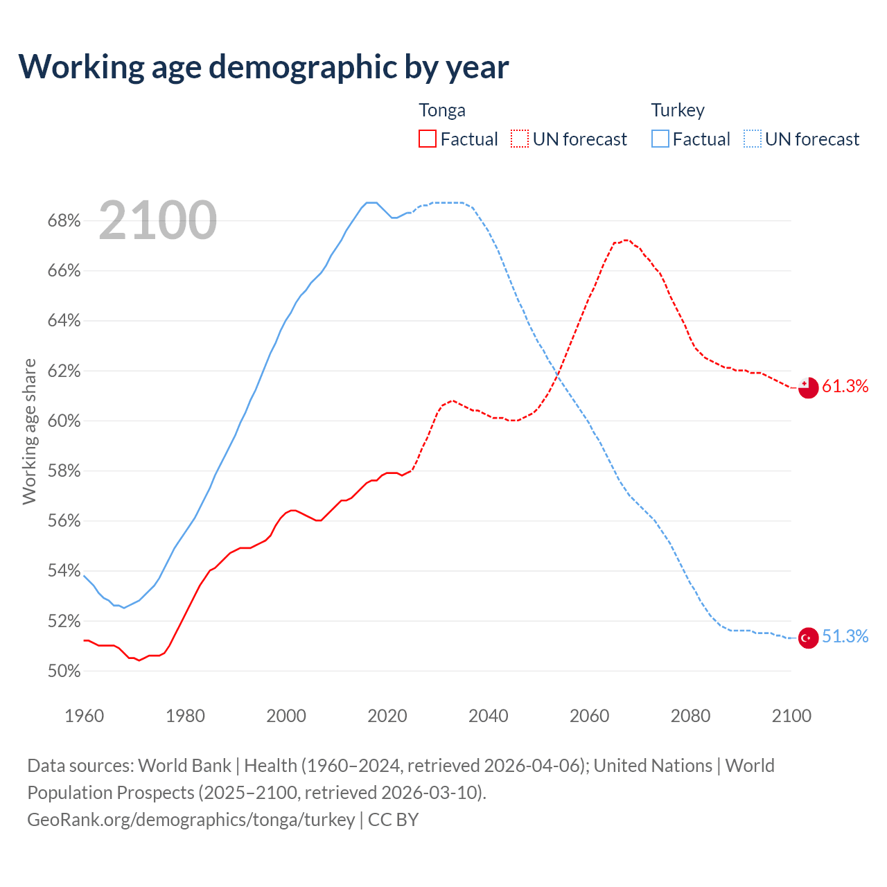- Tonga has 59.8K working age adults (aged 15-64) vs 58.7M in Turkey.