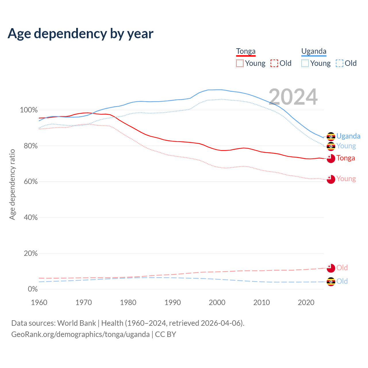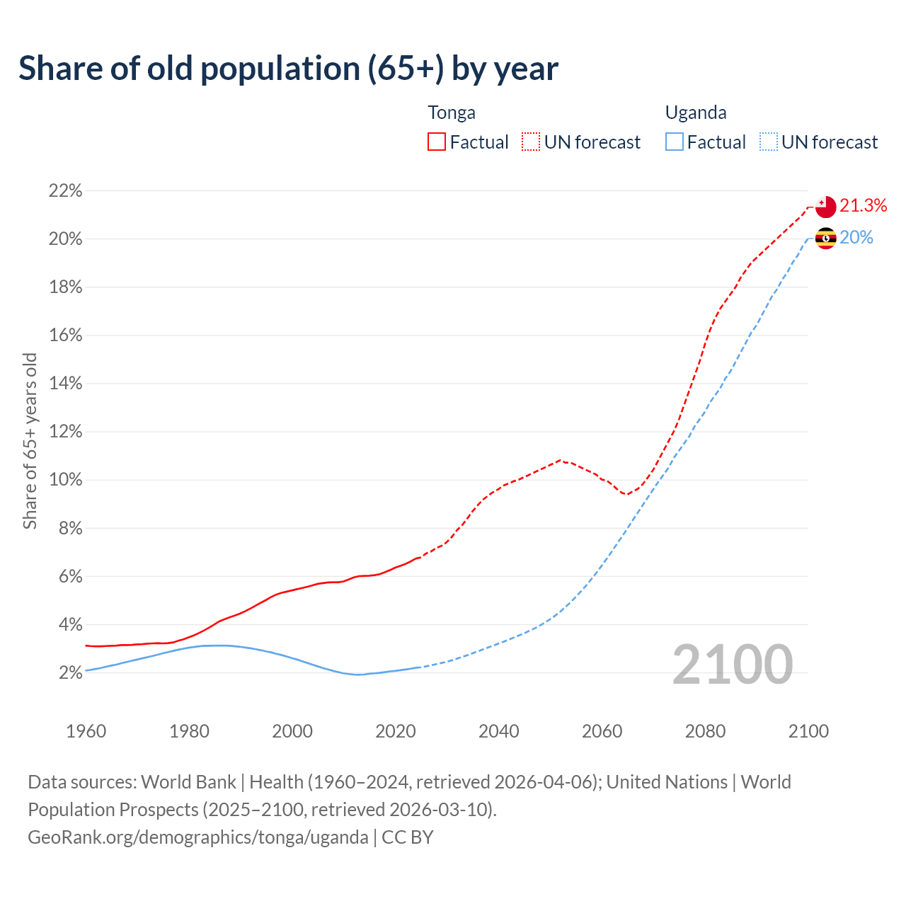 - The share of old-age demographic (65+) in Tonga is 6.72% vs 2.19% in Uganda.