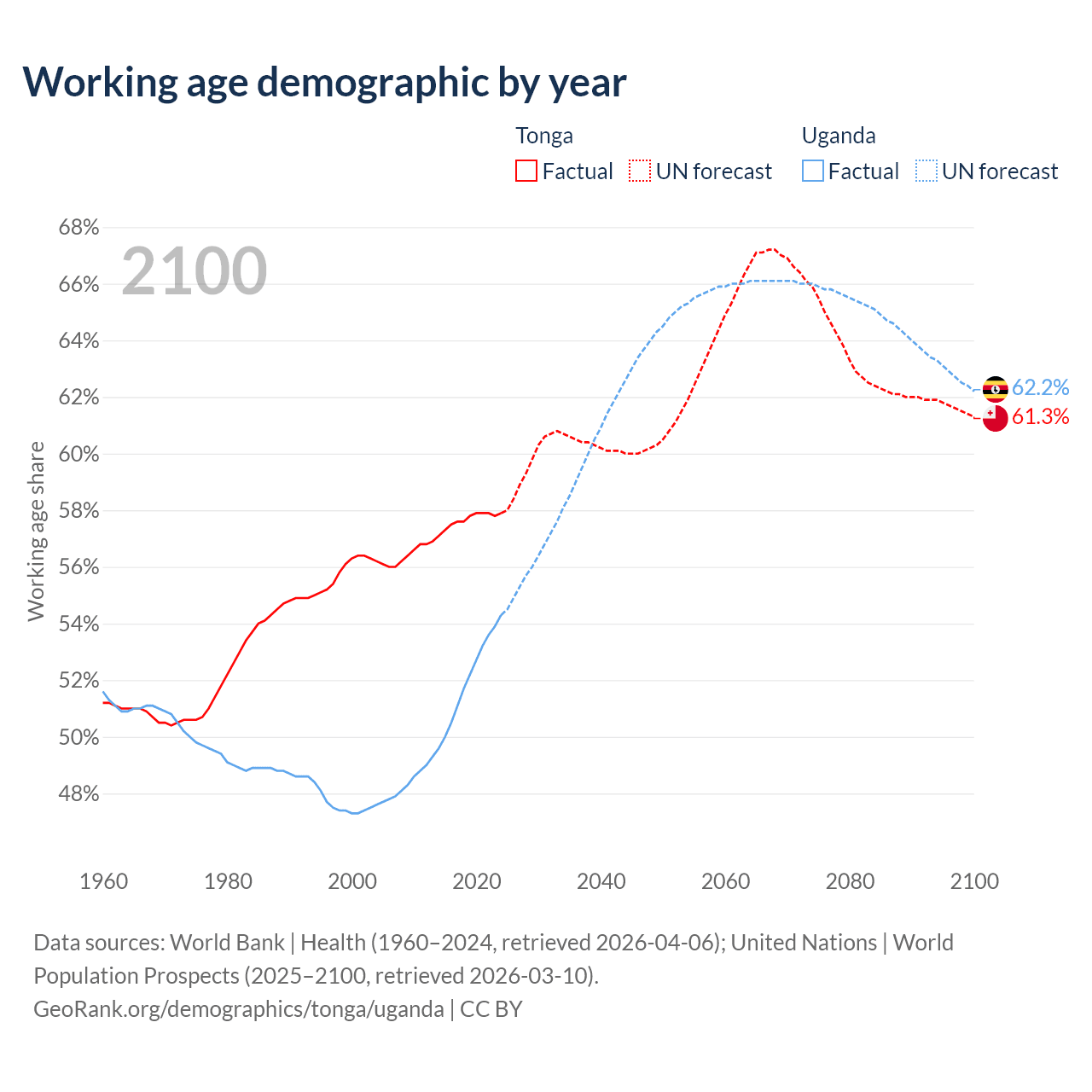 - Tonga has 59.8K working age adults (aged 15-64) vs 28.9M in Uganda.