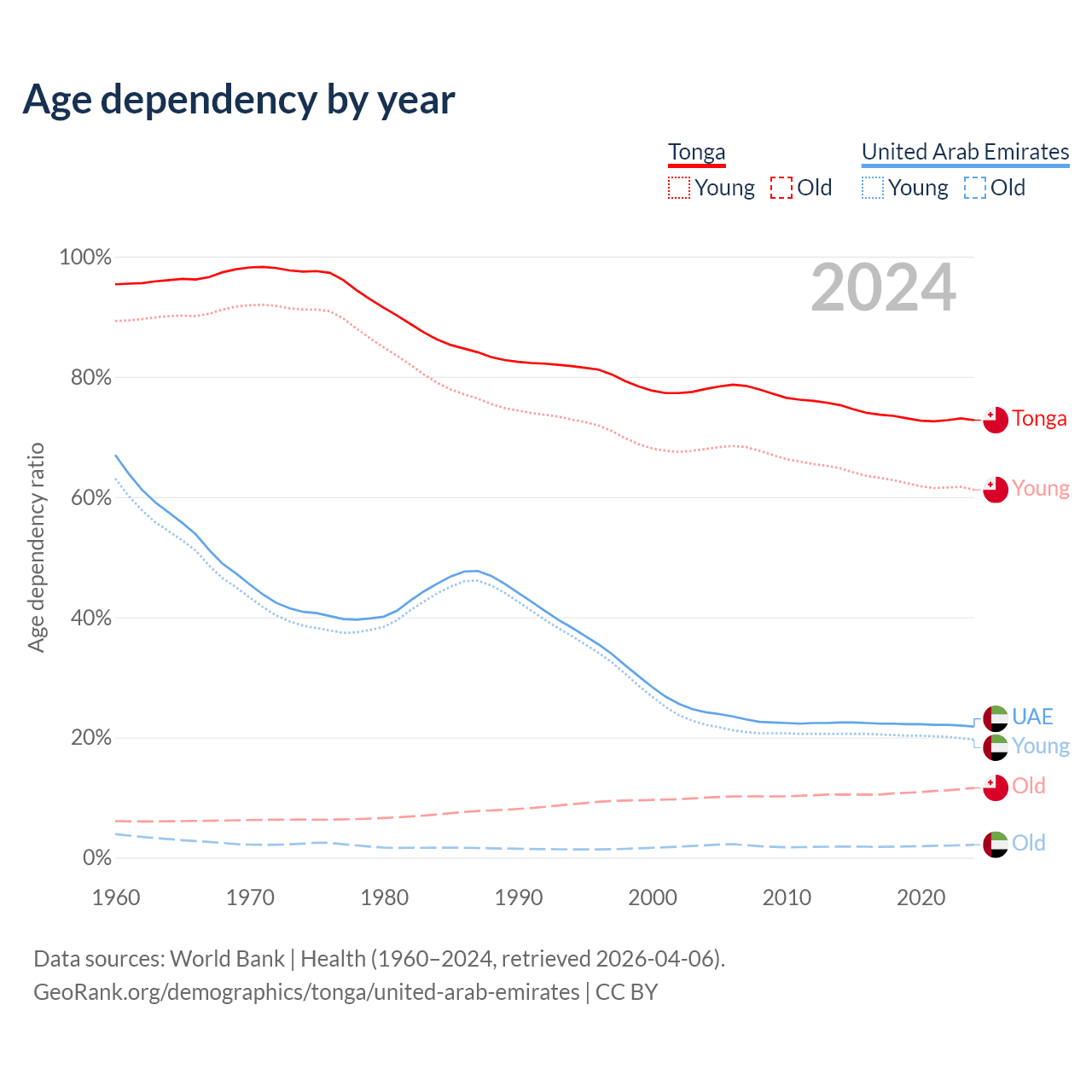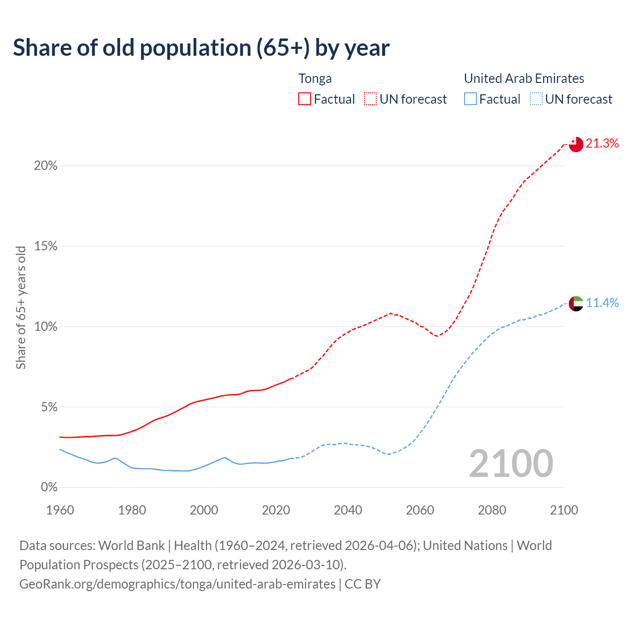 - The share of old-age demographic (65+) in Tonga is 6.72% vs 1.77% in the United Arab Emirates.