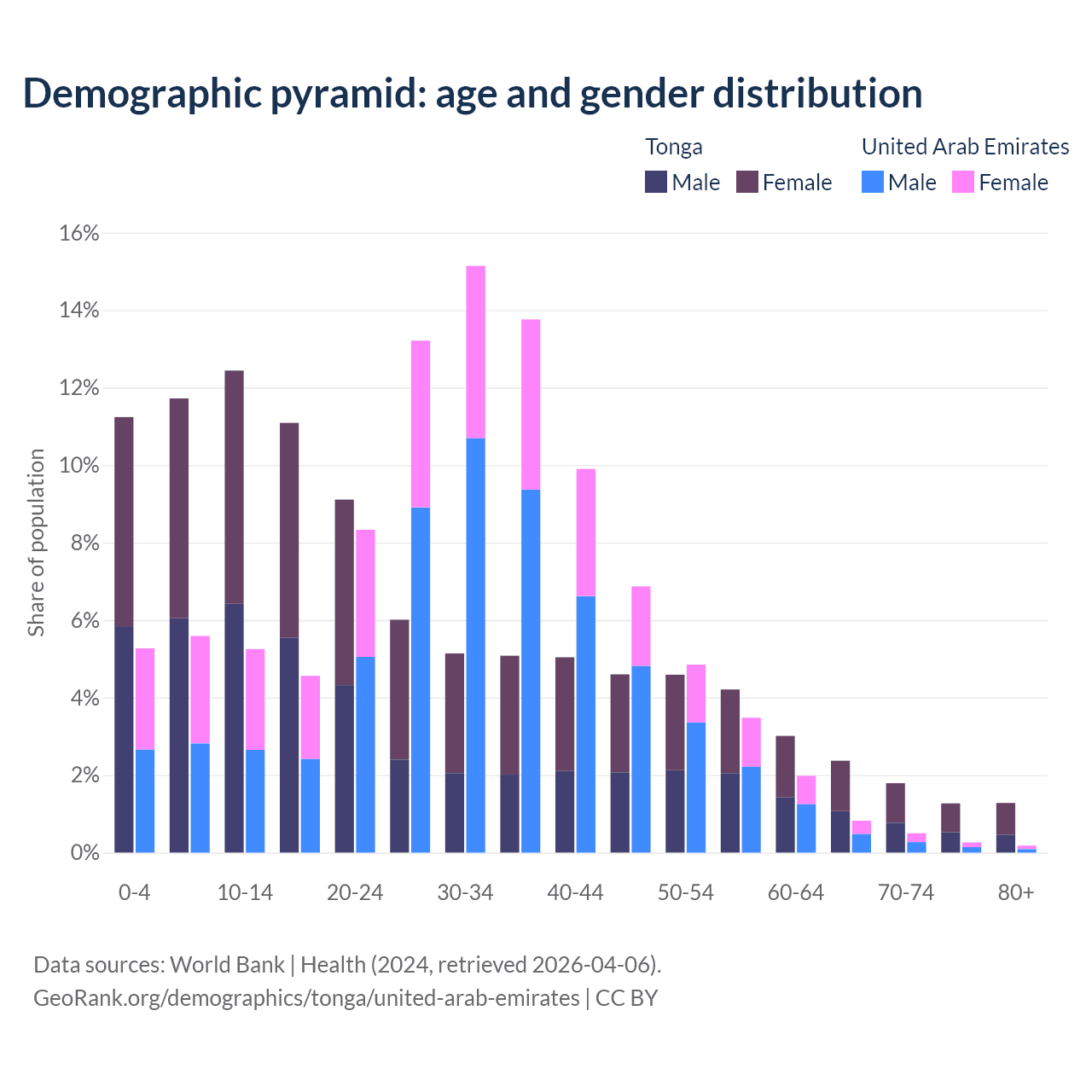 - Tonga is ranked 149/196 by median age (oldest to youngest) vs 91/196 for the United Arab Emirates.